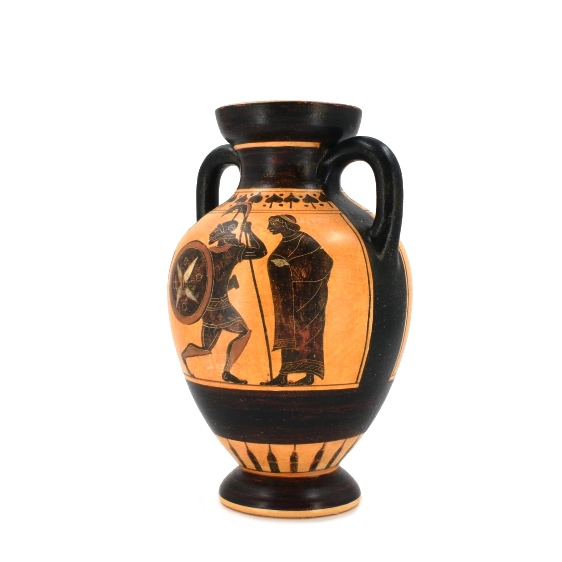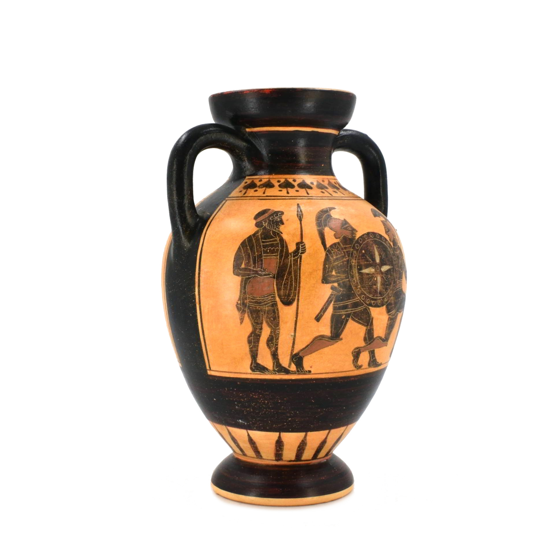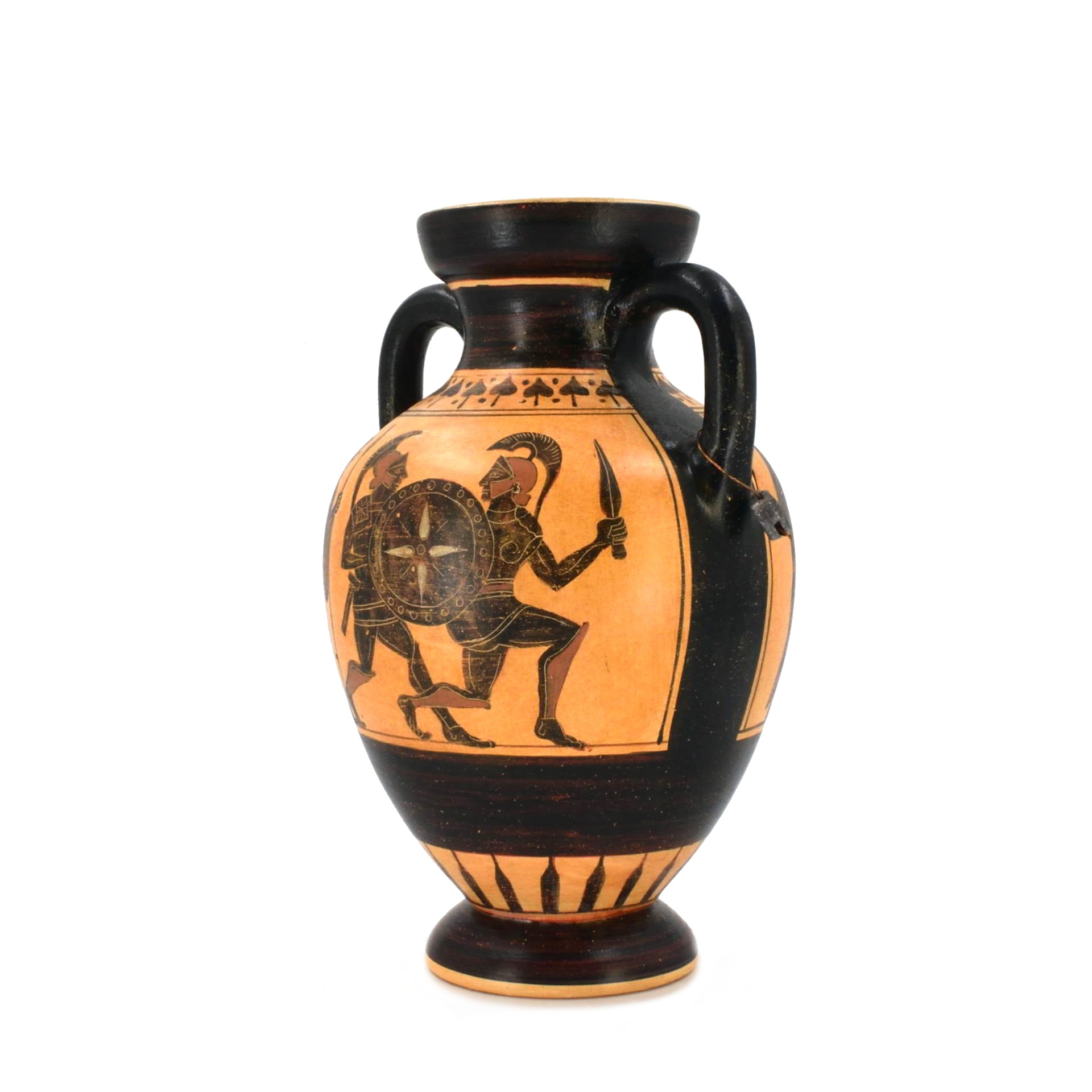 This amphora reproduces a classic Attic black-figure vessel from Athens, dating to the Archaic period around 530–520 BCE. Amphorae of this type were created in Athenian pottery workshops and decorated with mythological or martial scenes using the black-figure technique, in which silhouetted figures were painted and incised to reveal intricate details of armor, shields, and movement.