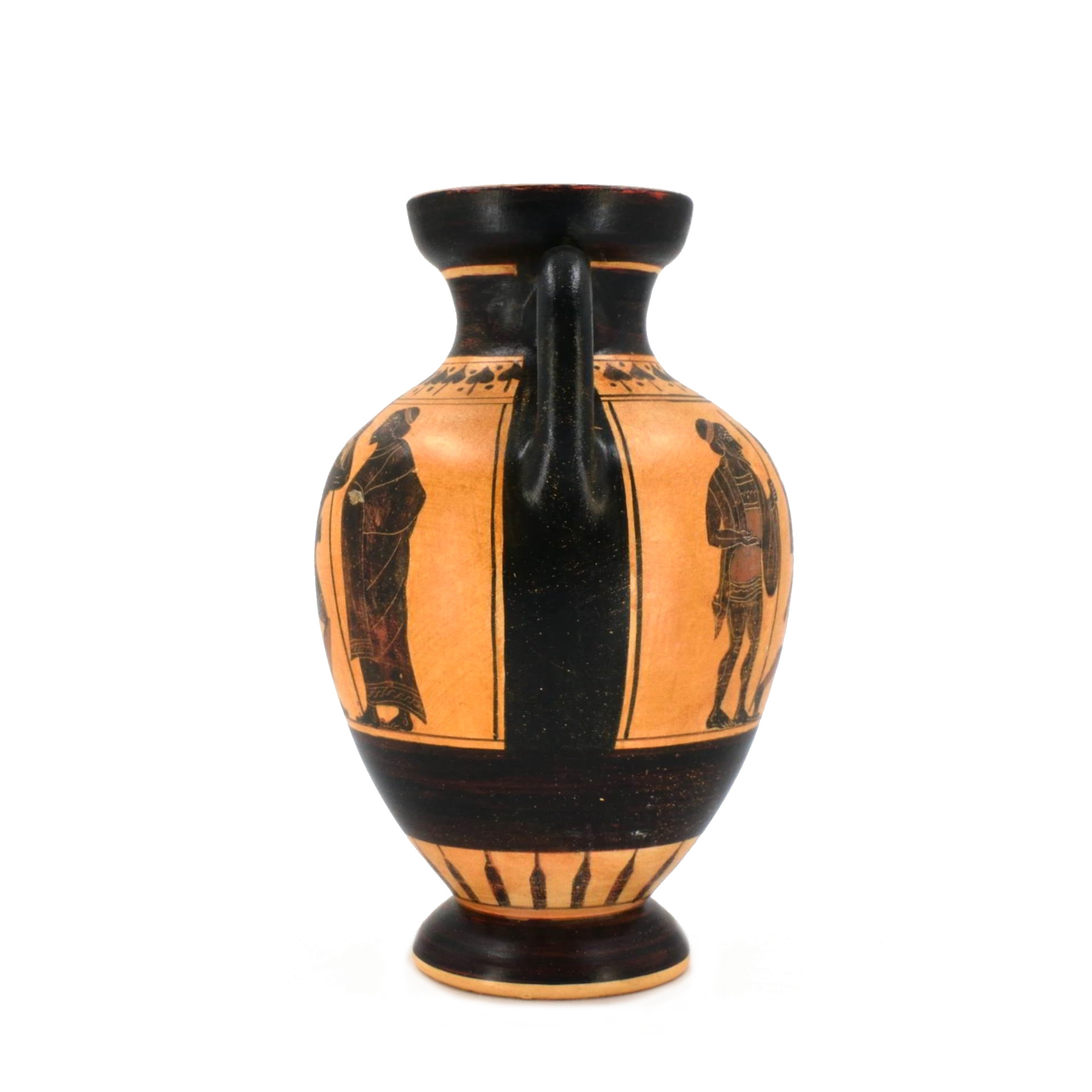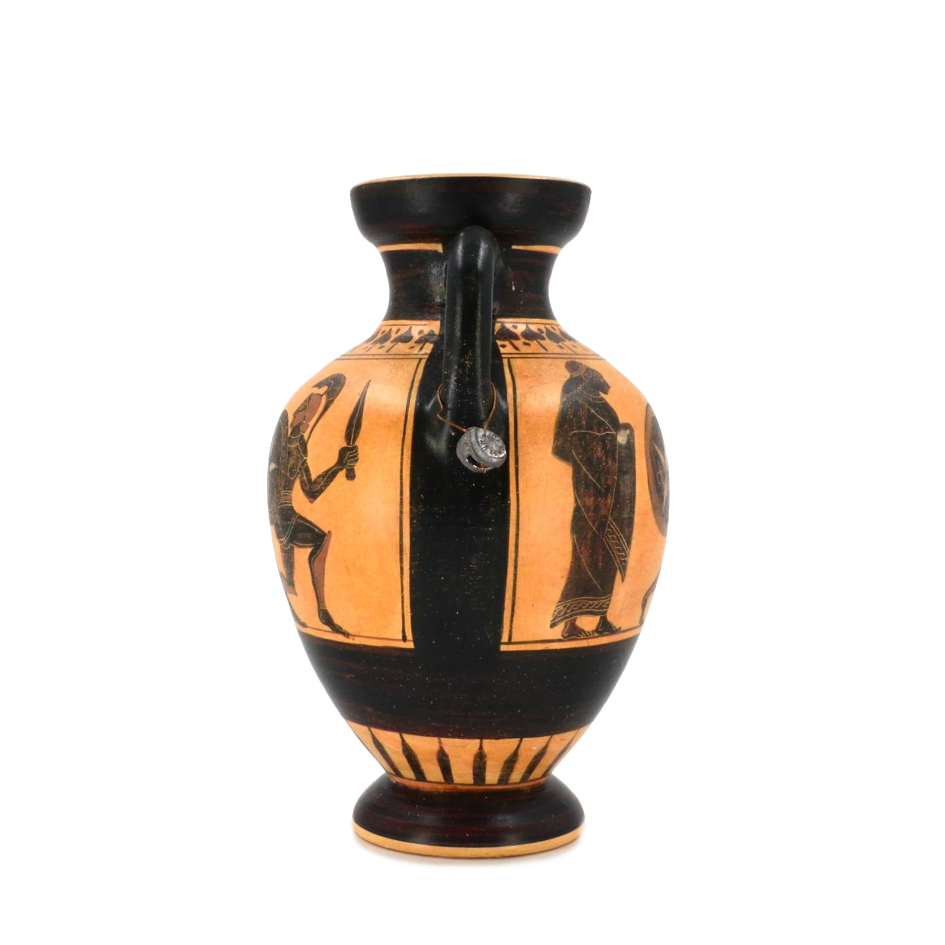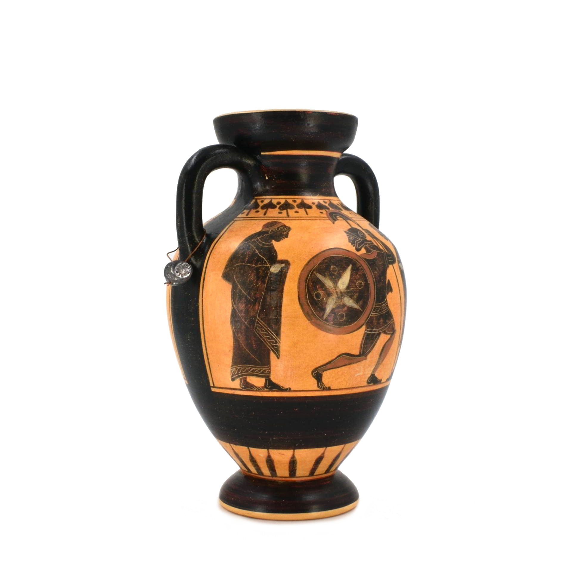 This amphora reproduces a classic Attic black-figure vessel from Athens, dating to the Archaic period around 530–520 BCE. Amphorae of this type were created in Athenian pottery workshops and decorated with mythological or martial scenes using the black-figure technique, in which silhouetted figures were painted and incised to reveal intricate details of armor, shields, and movement.
