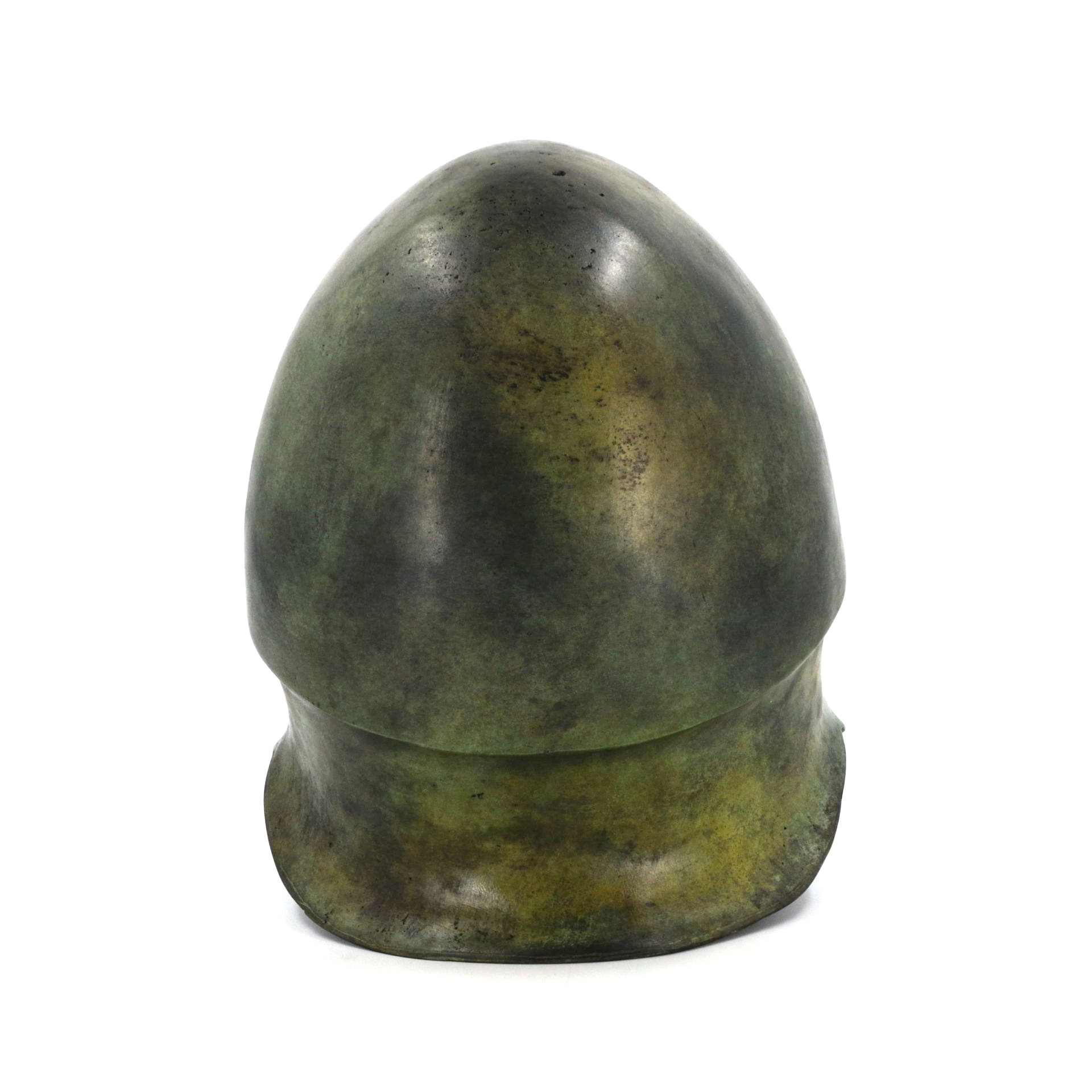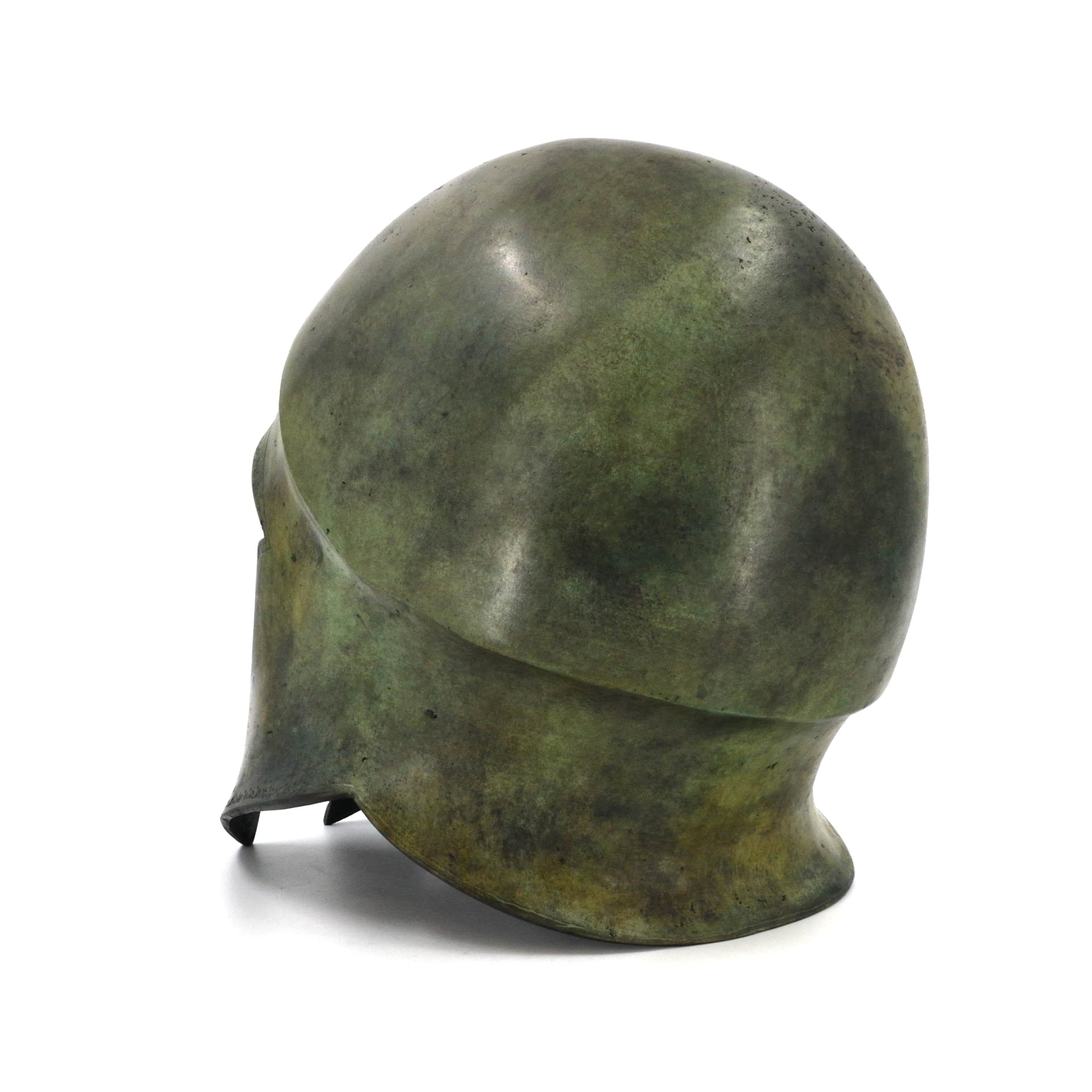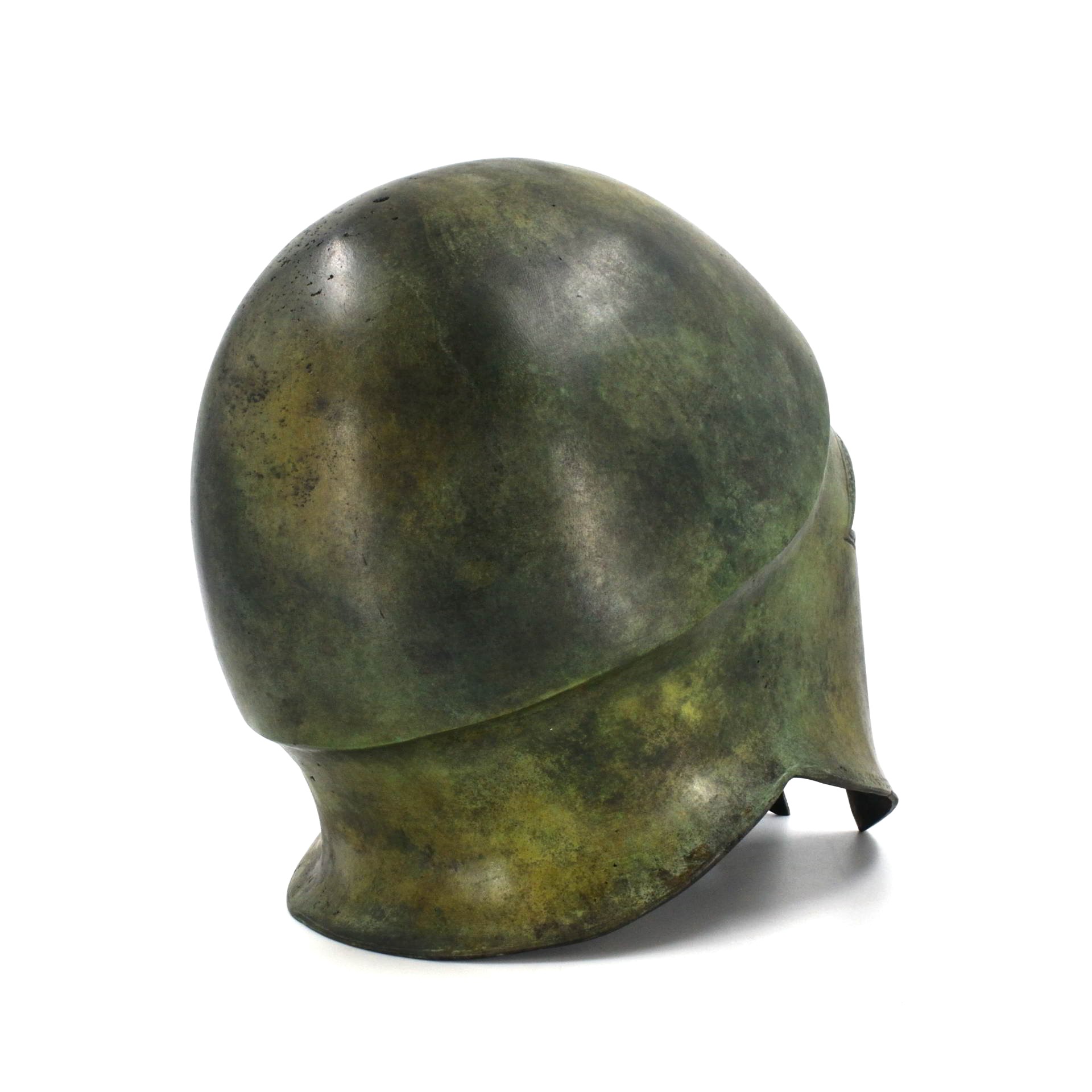 Characterized by its almond-shaped eye openings, elongated nasal guard, and sweeping cheek plates, the design offered both protection and an imposing presence on the battlefield. Subtle engraved borders around the facial openings added refinement, reflecting the Greek balance between utility and artistry. Over time, the helmet became more than armor—it evolved into a cultural emblem, appearing in sculpture, coinage, and later historical depictions of classical heroism. This replica faithfully captures the powerful contours and ornamental detailing that made the Corinthian helmet a lasting symbol of ancient martial identity.