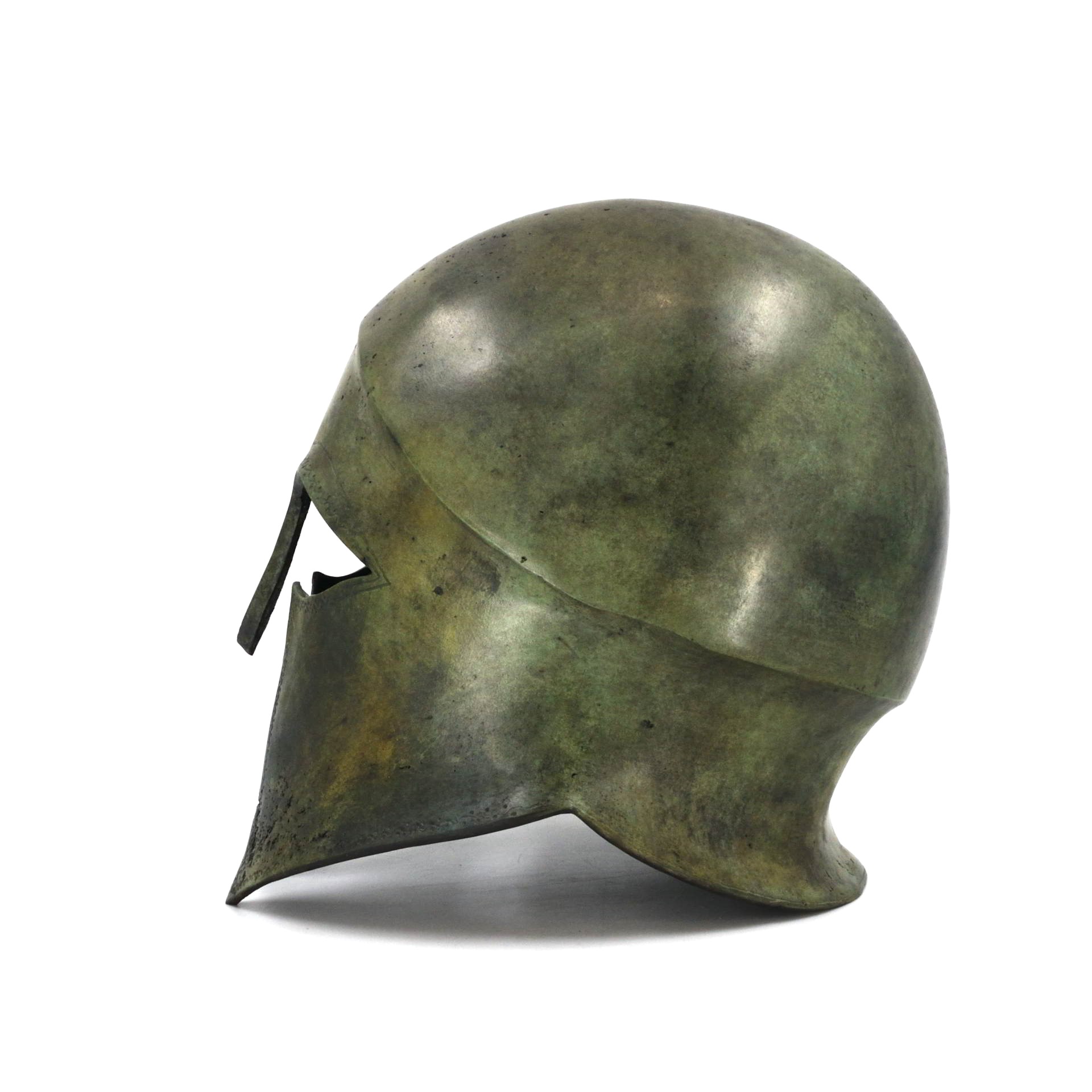 A detailed replica of a classical Greek Corinthian helmet, reflecting Archaic-era design and hoplite battlefield tradition.