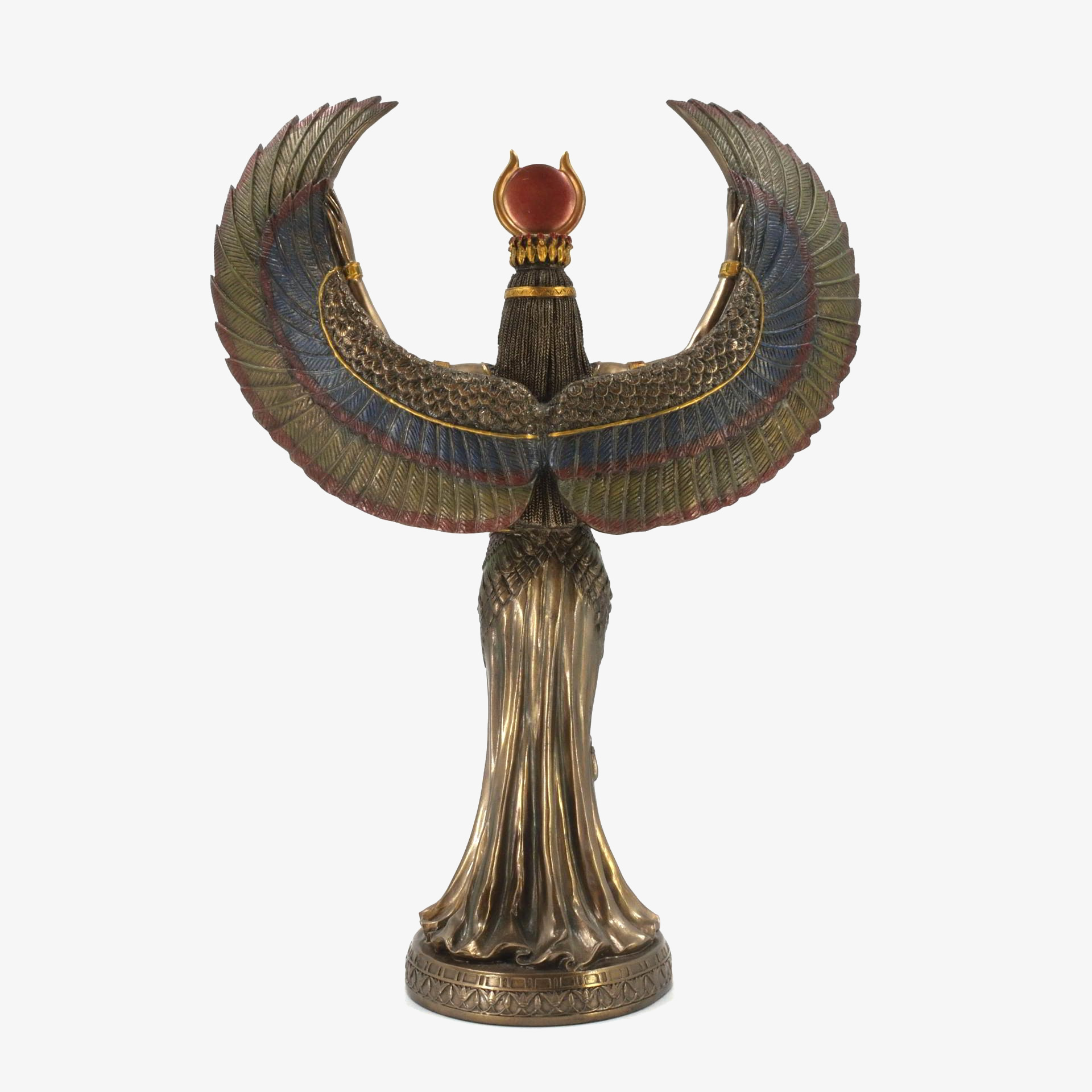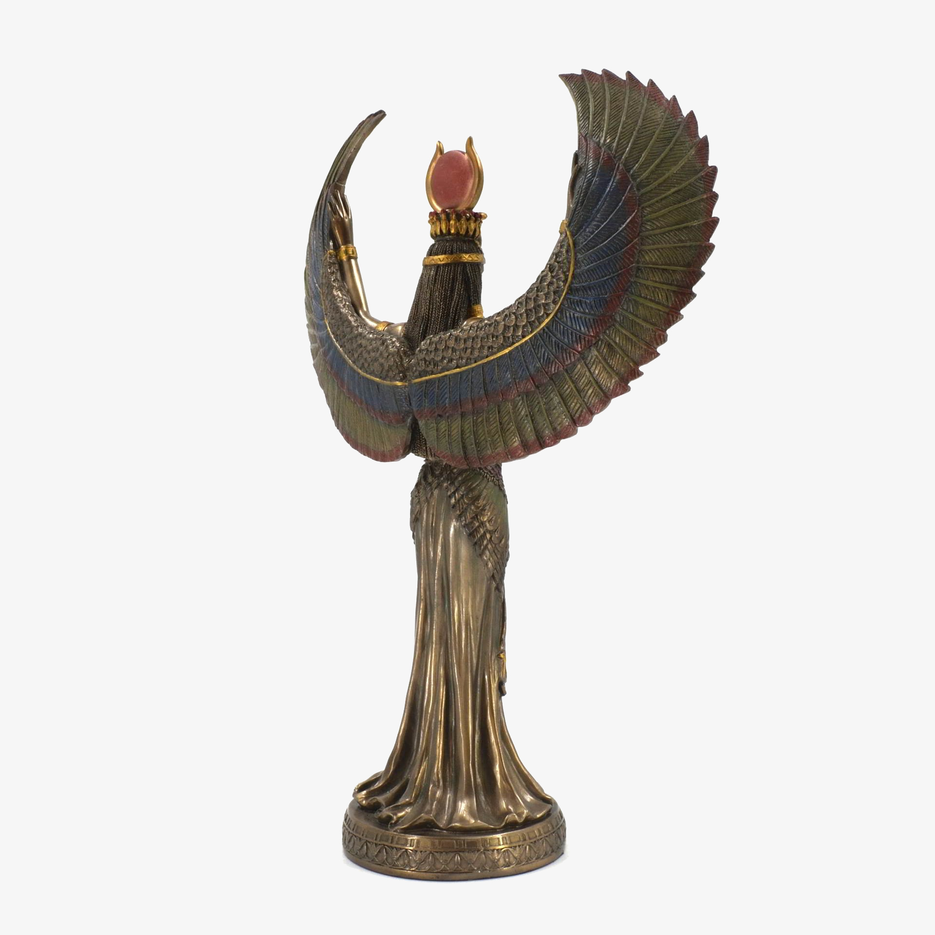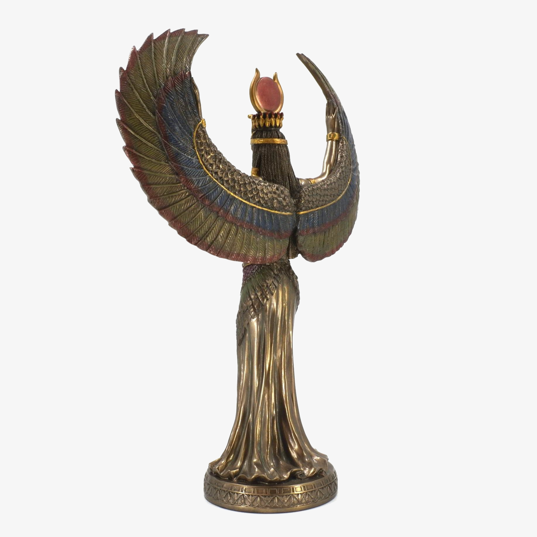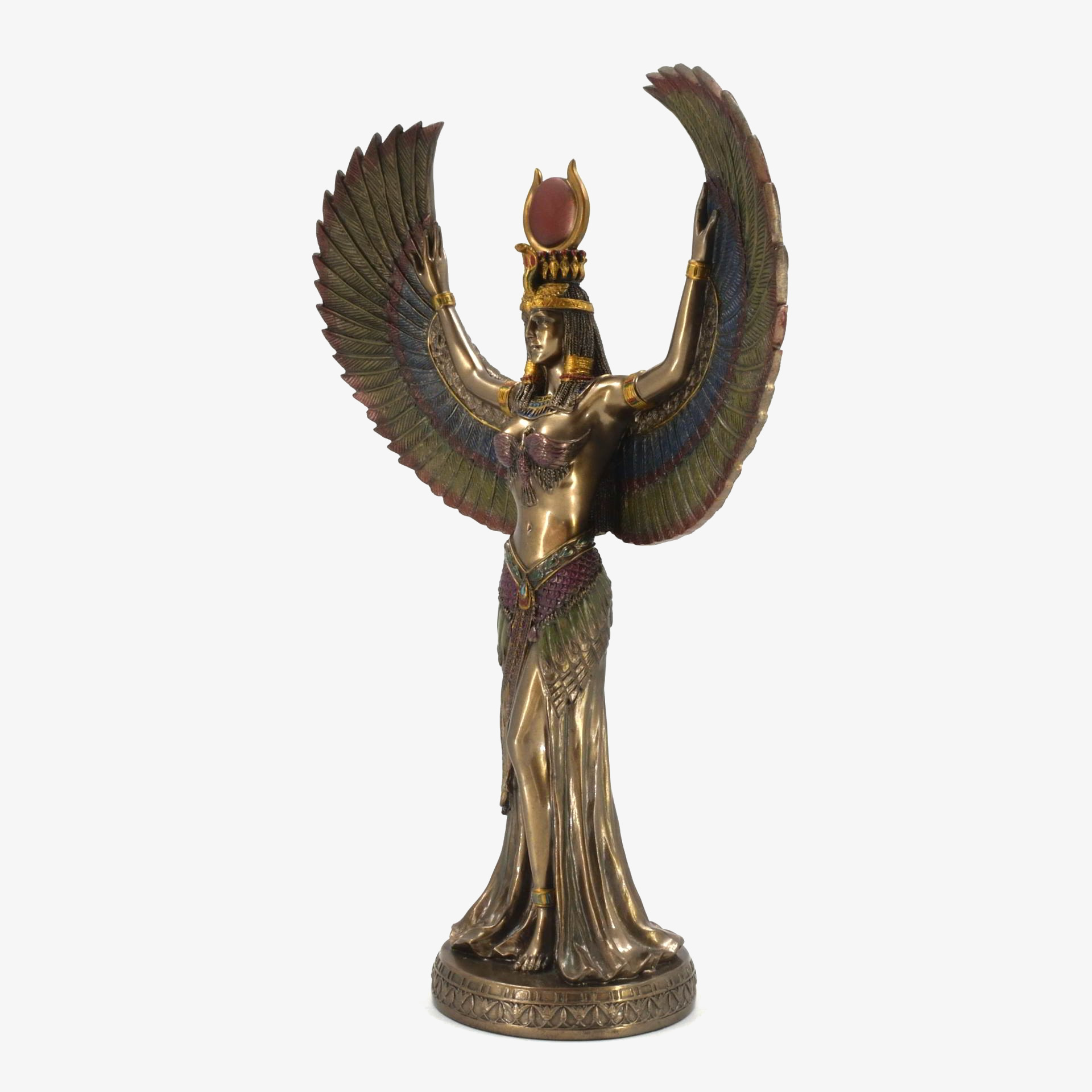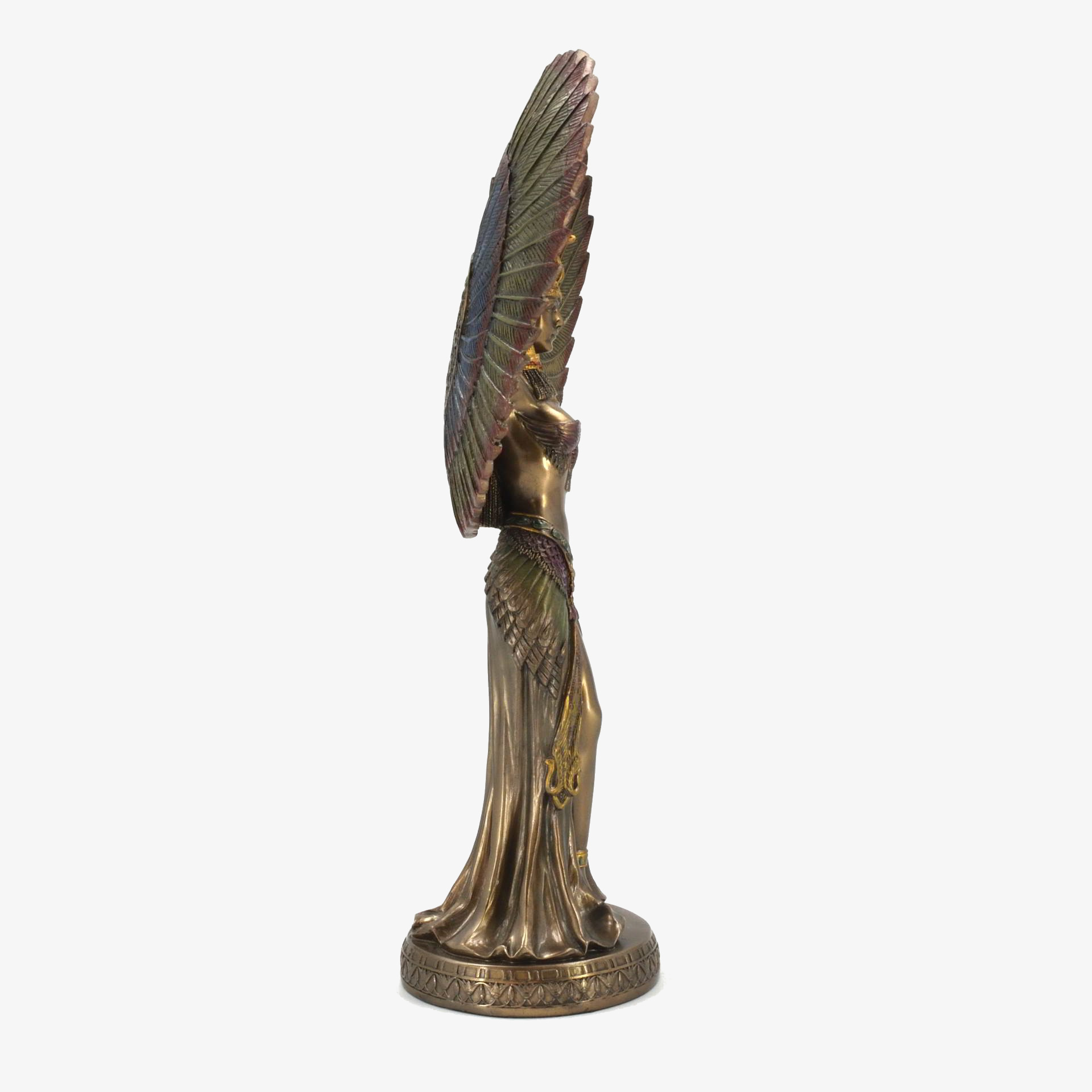 This bonded bronze statue depicts Isis, the revered Egyptian goddess of magic, motherhood, and protection. She is shown with outstretched wings, symbolizing her role as a guardian and bringer of life. As the wife of Osiris and mother of Horus, Isis played a central role in mythology, resurrecting Osiris and ensuring Horus’s rightful rule. Worshiped from the Old Kingdom (c. 2600 BCE) to the Roman era, her cult spread from Egypt to Greece and Rome, with temples like Philae dedicated to her. This statue captures her divine grace, embodying love, wisdom, and the mystical power of resurrection.