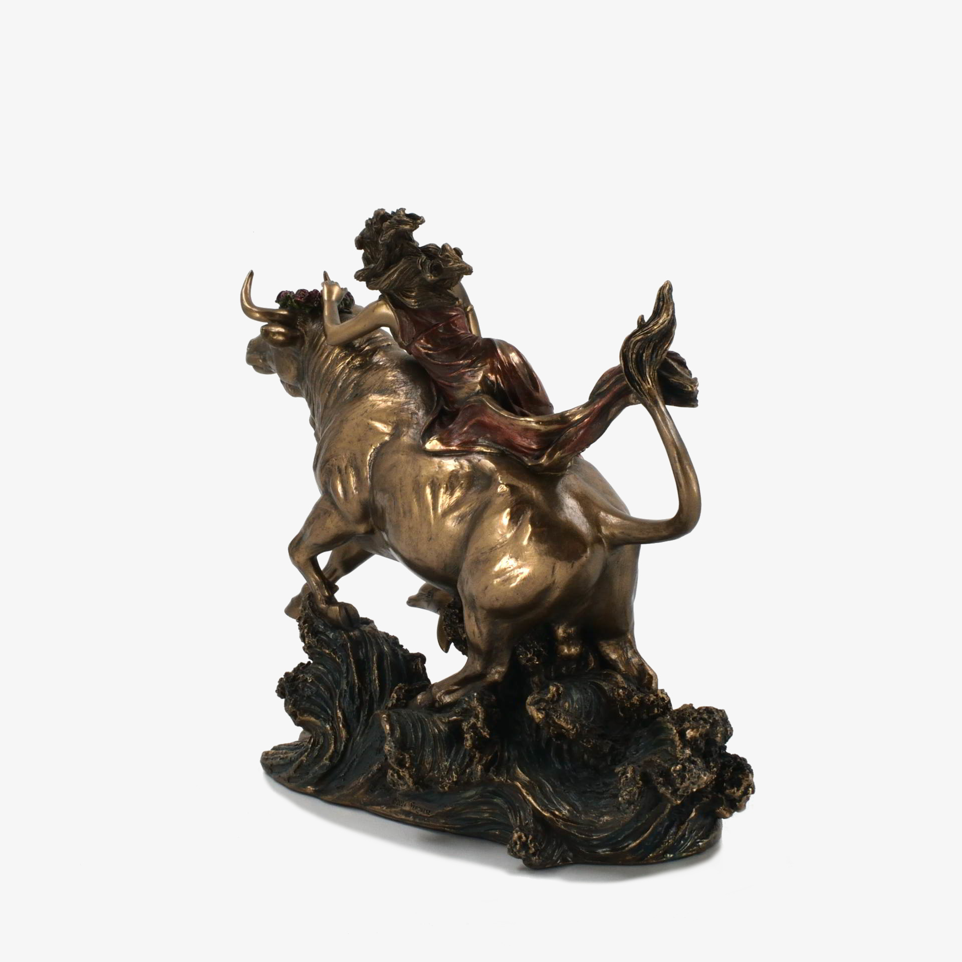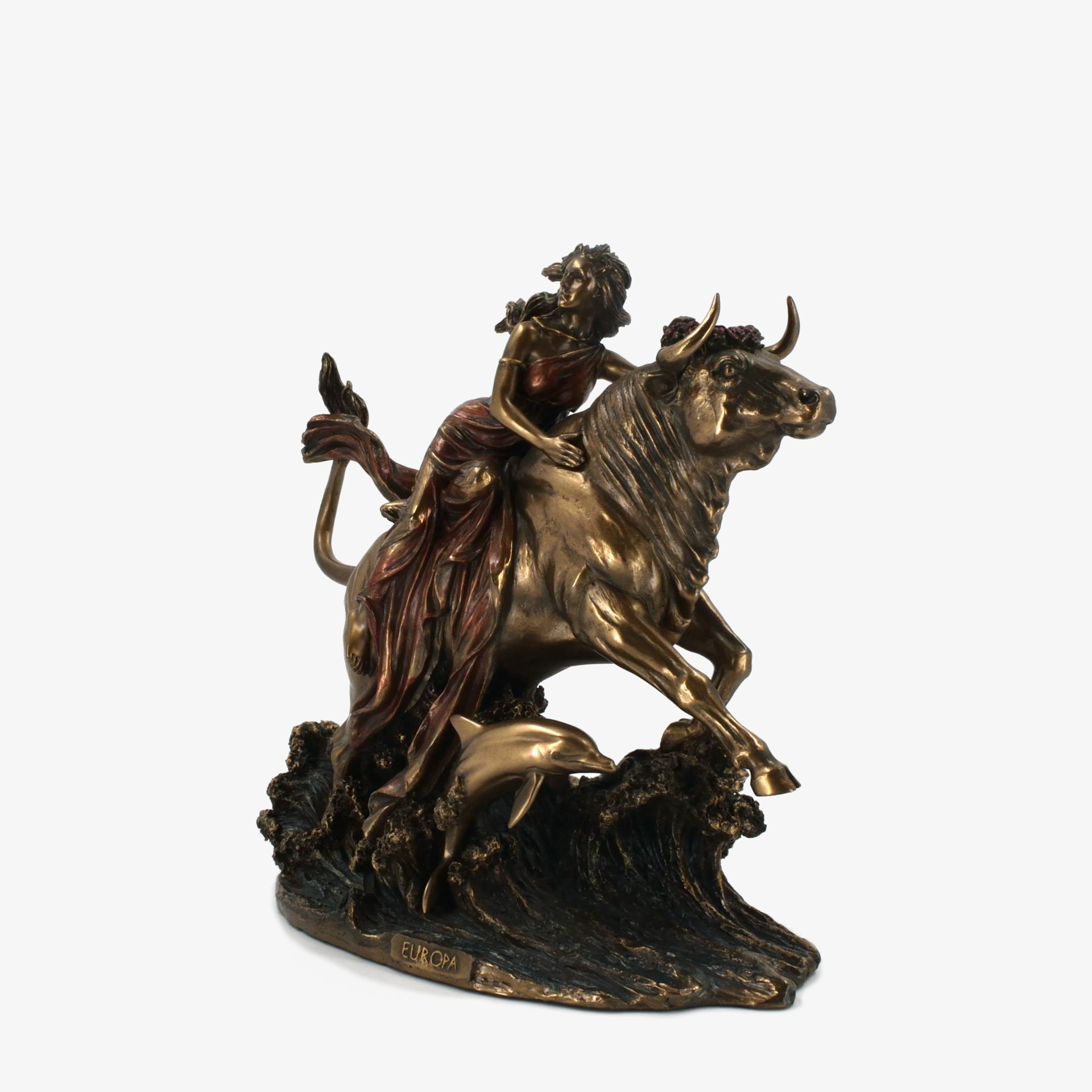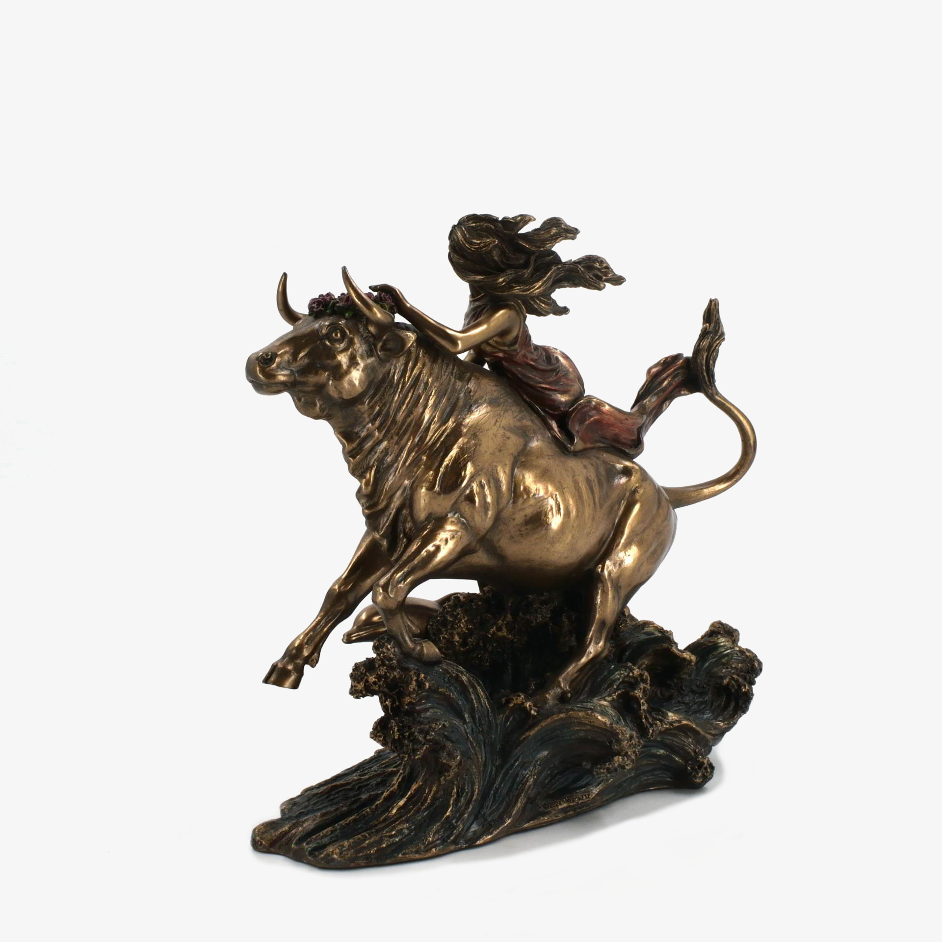 This sculpture depicts the myth of Europa, a Phoenician princess abducted by Zeus, who transforms himself into a powerful bull to carry her across the sea. Europa is shown seated upon the animal’s back, her posture balanced between trust and uncertainty as the bull moves forward through churning water. The surrounding waves and sea creatures emphasize motion and the crossing from one world into another.