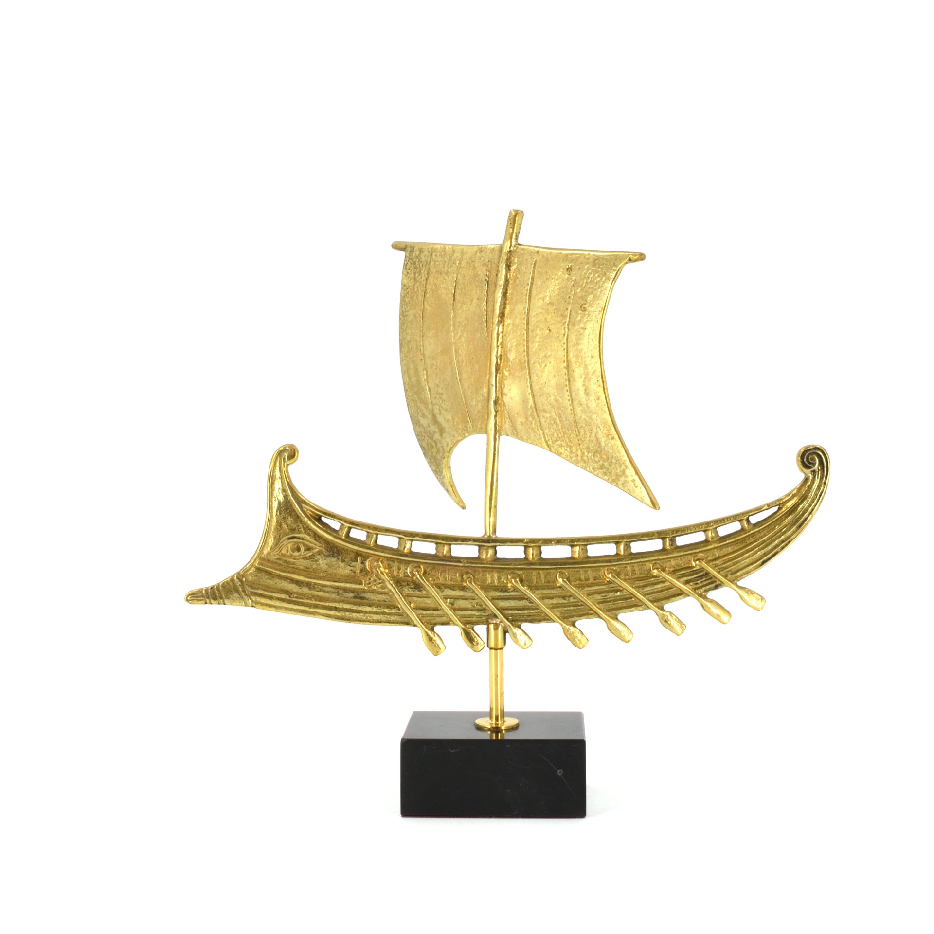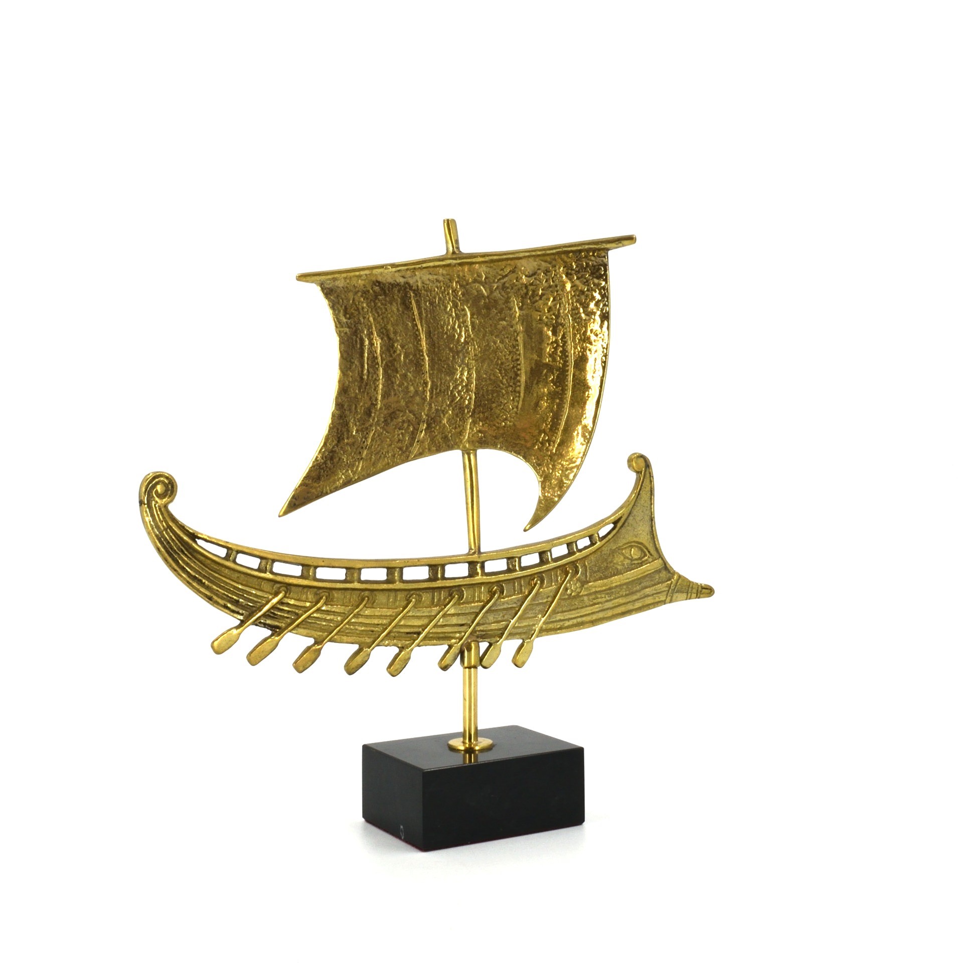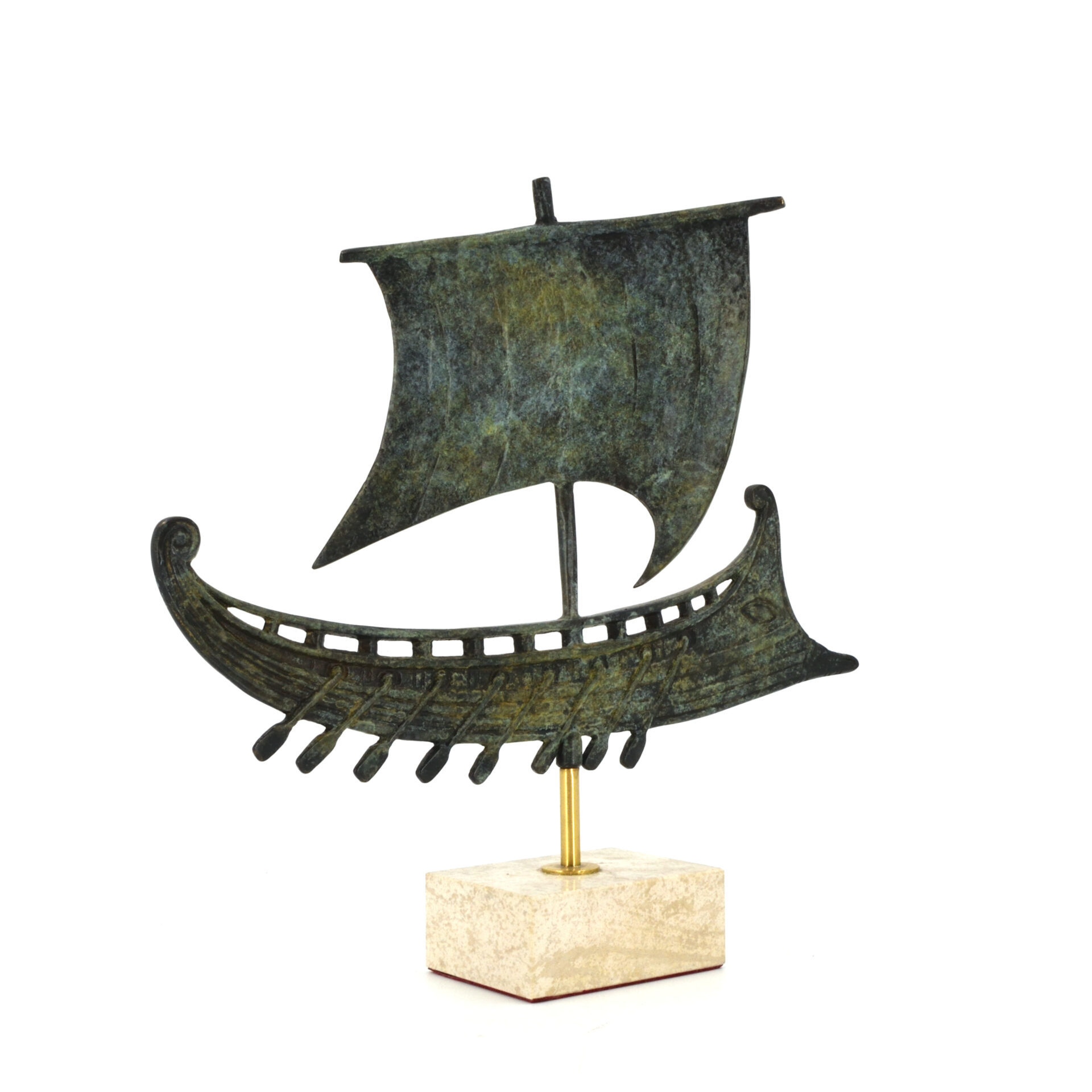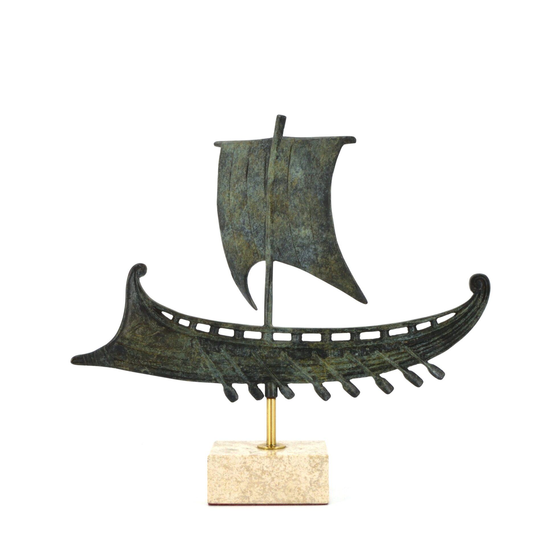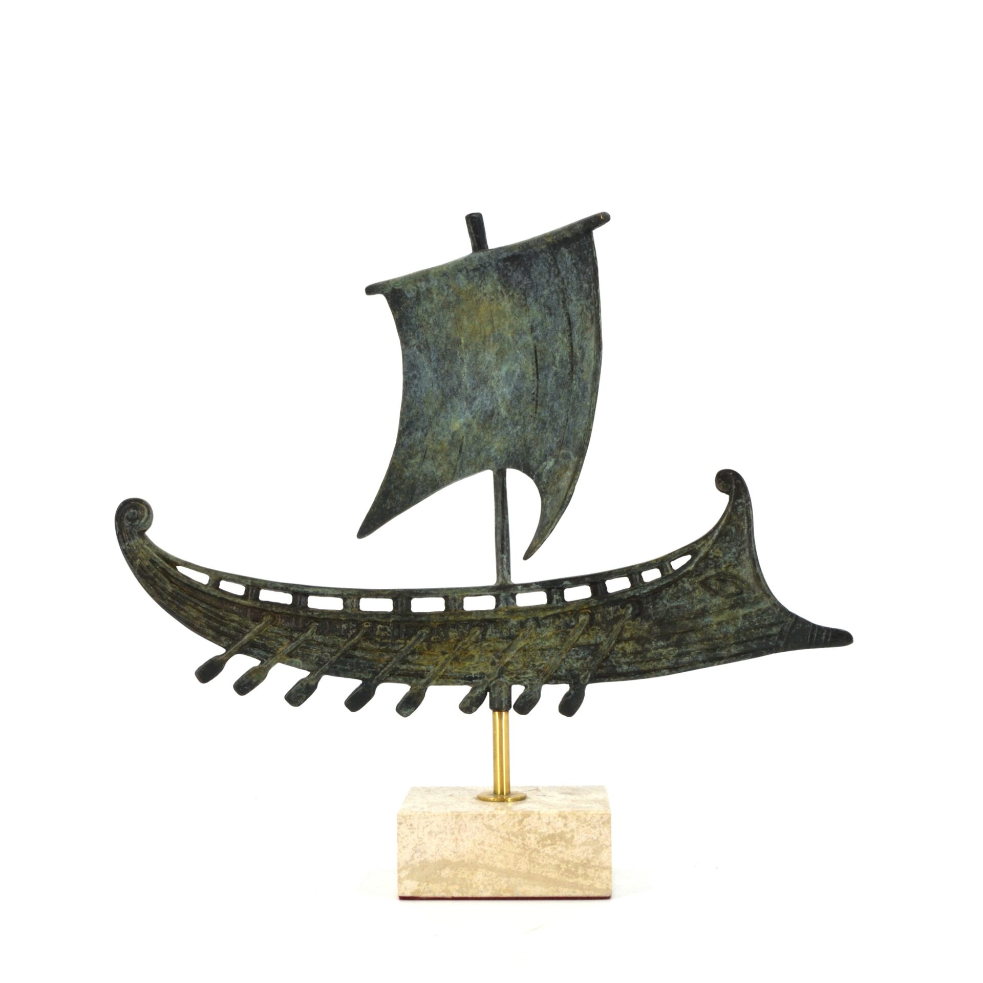This sculptural replica represents the ancient Greek Triērēs (trireme), the dominant warship of the Classical period and a symbol of Athenian naval power. Triremes were extensively built and used in Athens during the 5th century BCE, particularly throughout the Persian Wars and the Peloponnesian War. The naval base of Piraeus served as the heart of this maritime empire, housing fleets that secured trade routes and defended the Greek world.