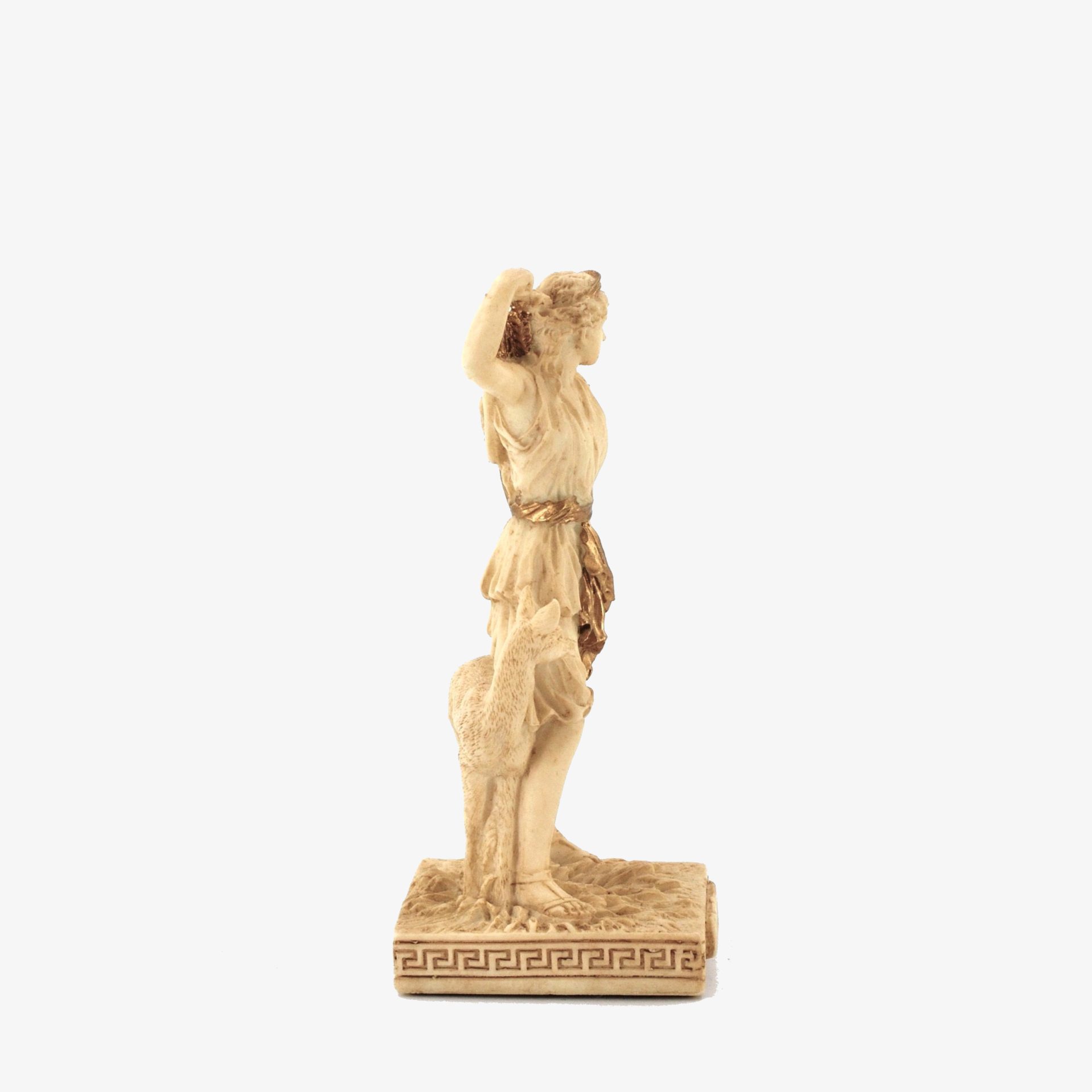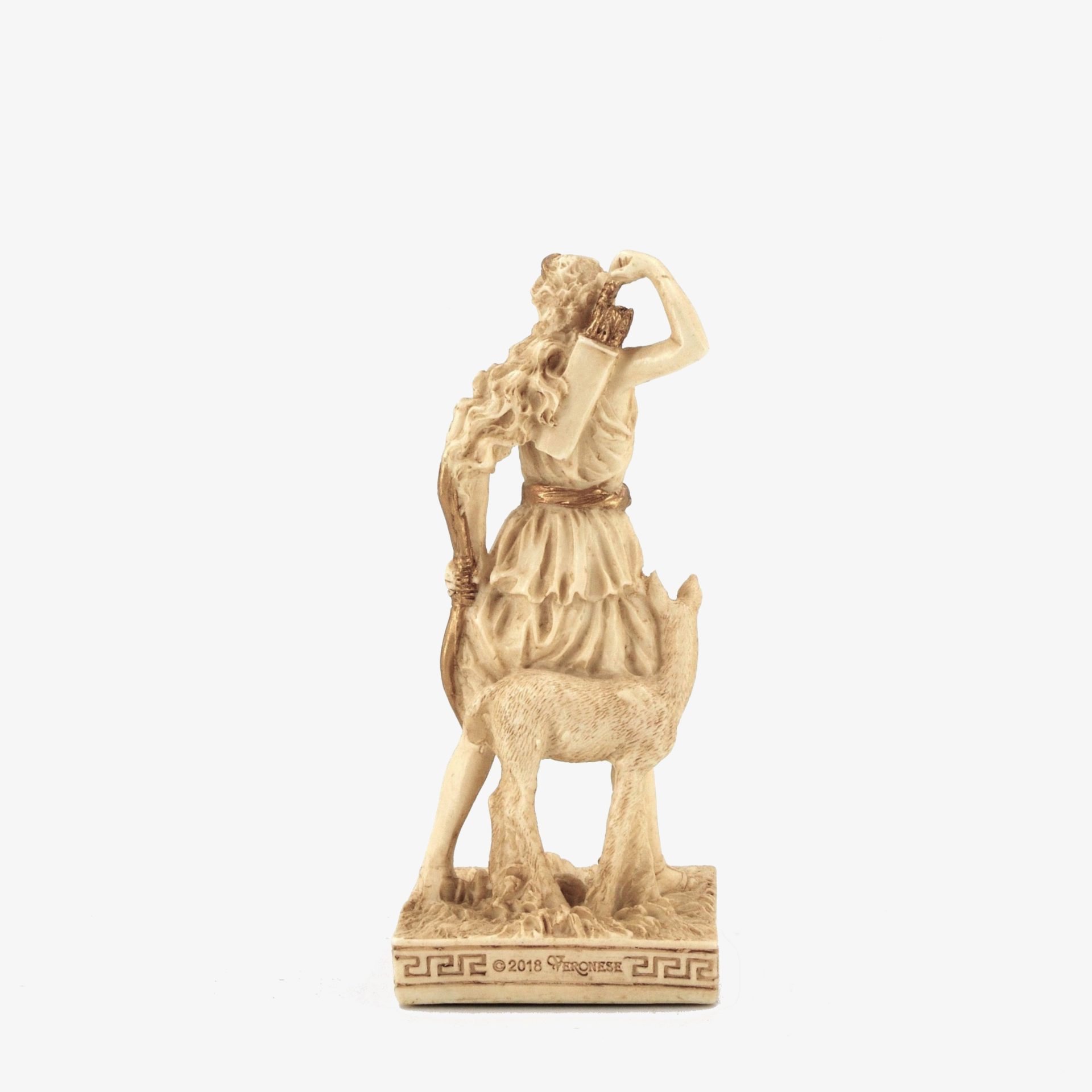 This bonded bronze figure depicts Artemis, inspired by the famed "Diana of Versailles." She is portrayed in motion, donning a short tunic, with a bow-reaching gesture, accompanied by a deer—symbolizing her role as the huntress. Artemis, daughter of Zeus and Leto and twin of Apollo, was born on Delos. She aided her mother in birthing Apollo, becoming a protector of women and children. As the Greek goddess of the hunt, wilderness, and the moon, she wielded a bow and arrows, punishing disrespect and guarding nature. Revered for independence and chastity, Artemis remained a powerful, untamed deity in Greek mythology.