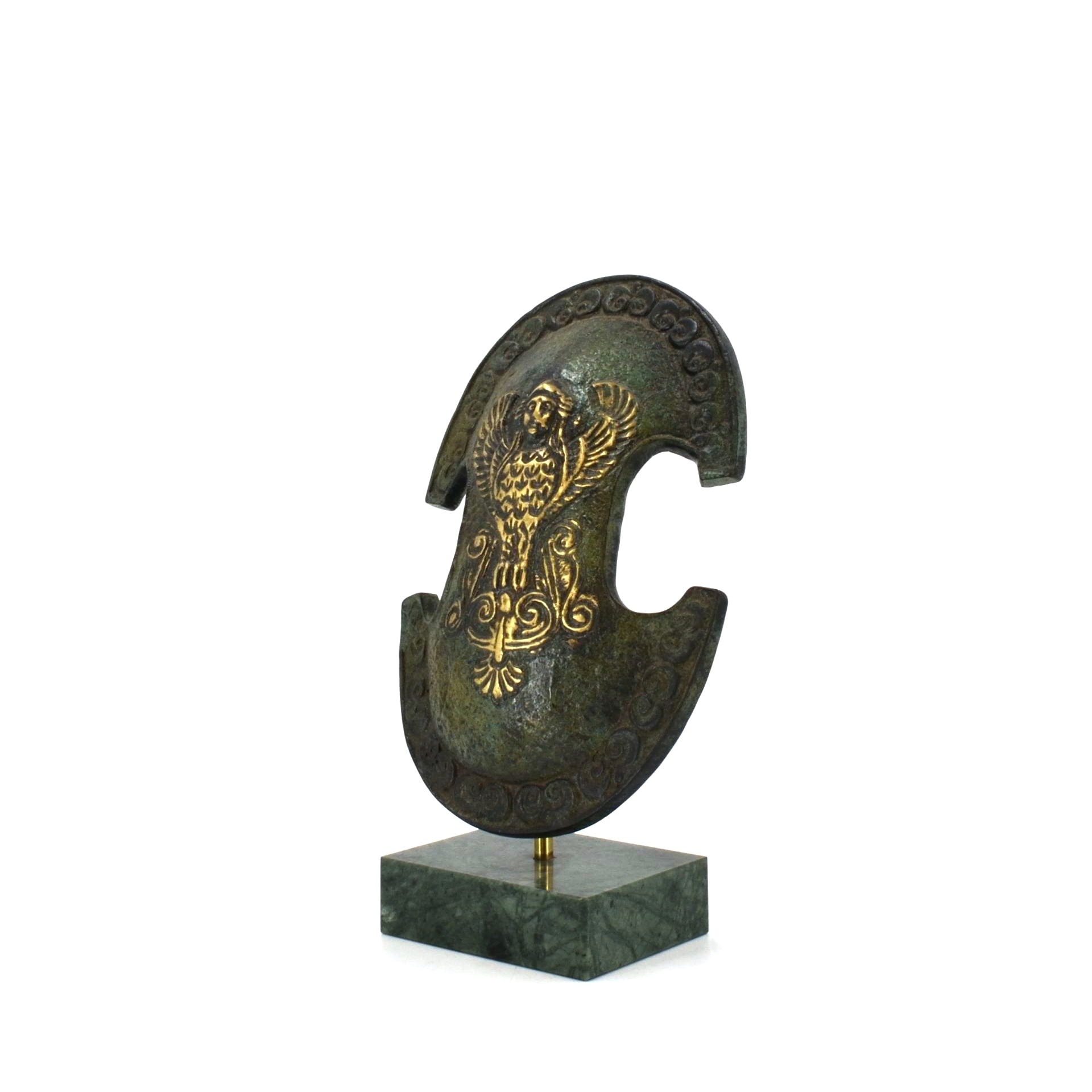The shield is identified by its unique shape, with deep lateral cutouts that reduced weight while allowing greater freedom of movement. At its center appears a winged Gorgon figure rendered in relief, a powerful apotropaic motif widely used in Greek warfare. The Gorgon’s image was believed to repel danger and intimidate opponents, while also invoking divine protection for the bearer.