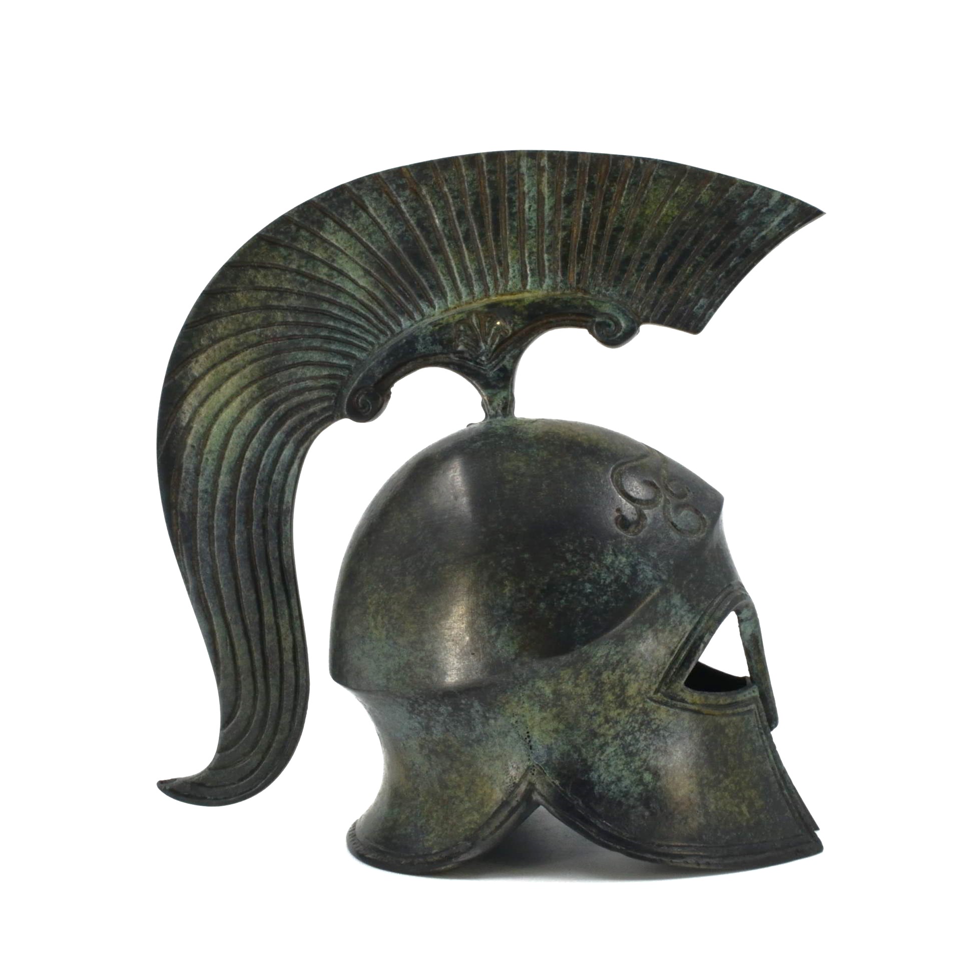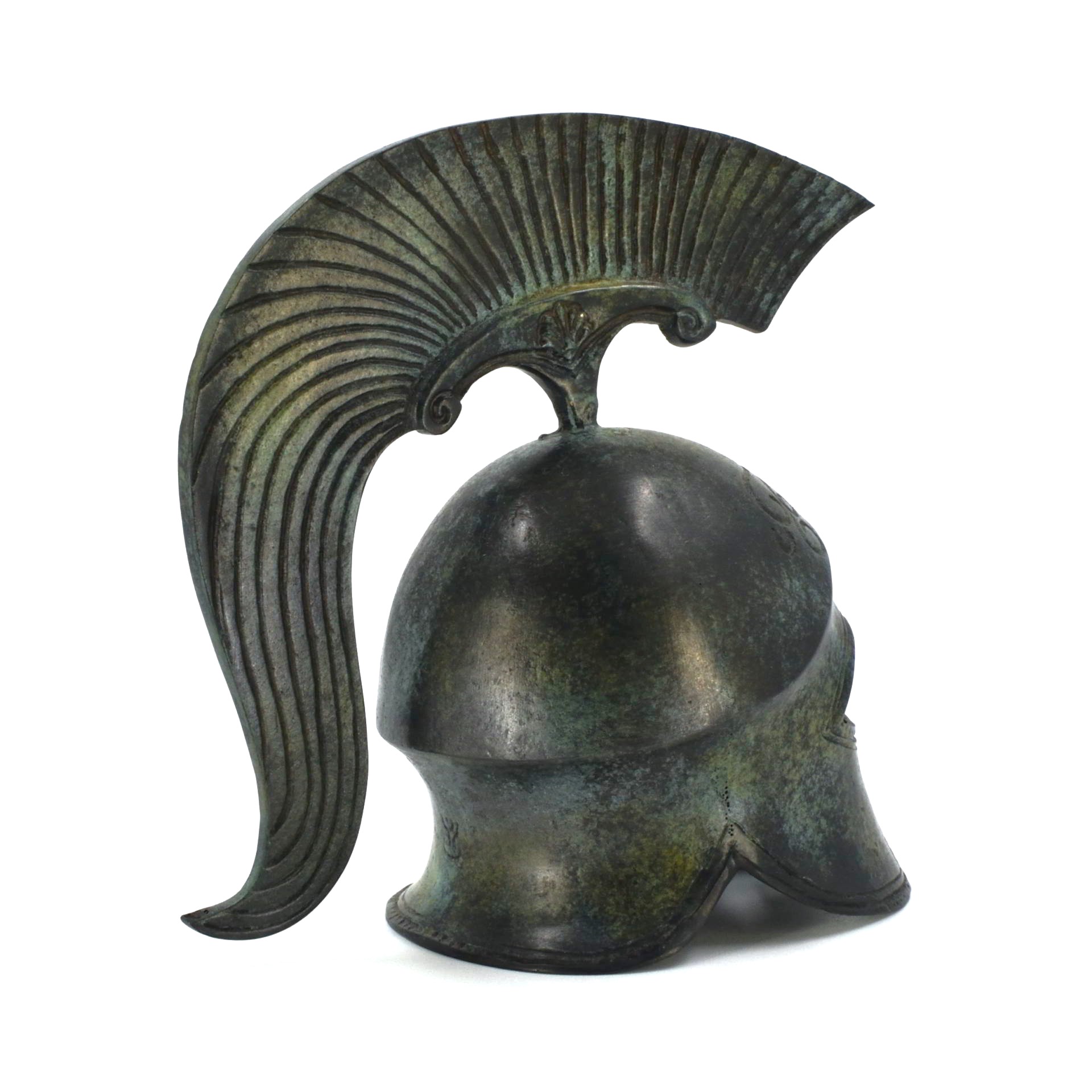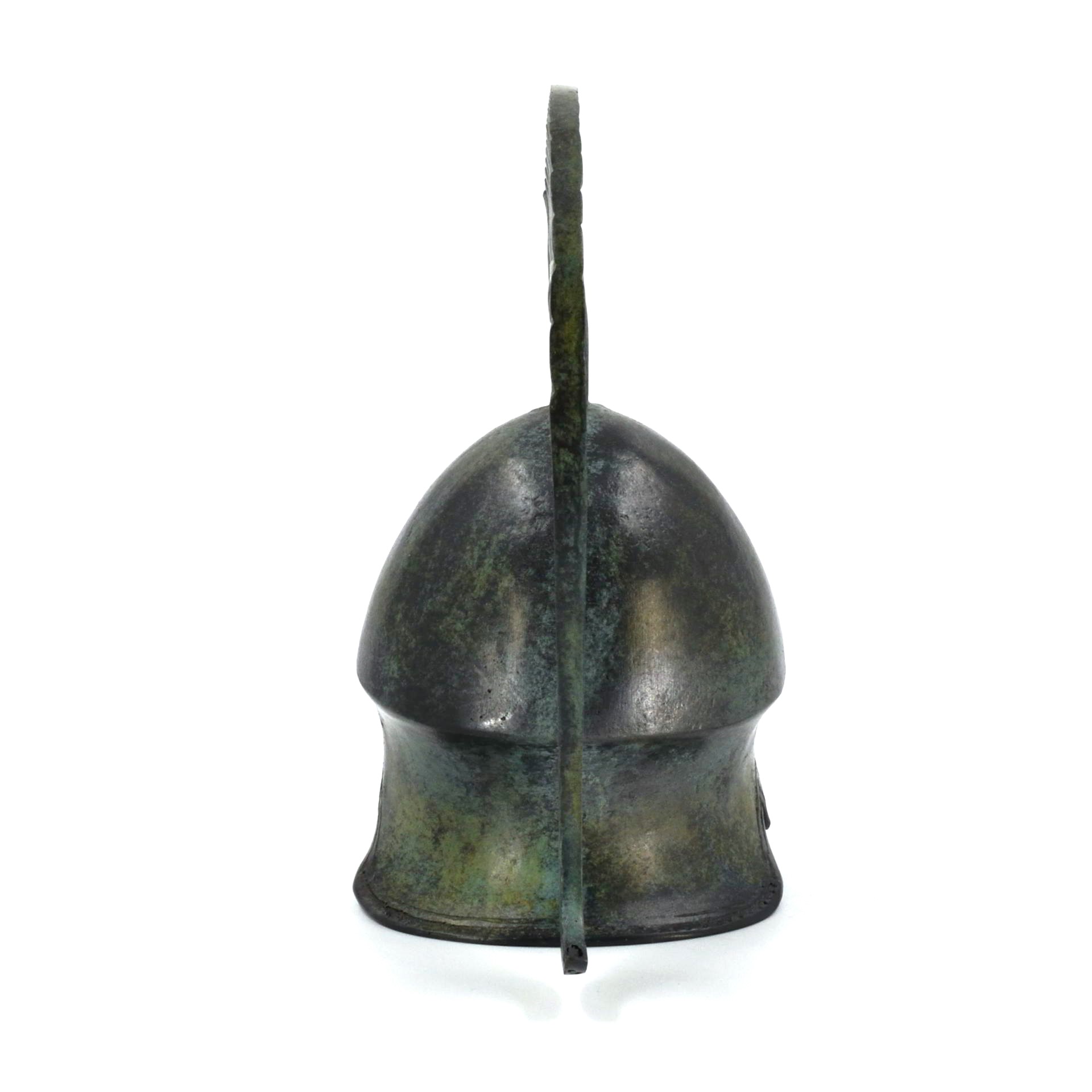 This helmet belongs to the Corinthian type, one of the most recognizable forms of protective headgear used by Greek hoplites. Its fully enclosing design, with narrow eye openings and an extended nose guard, reflects an emphasis on frontal protection during close-order combat. Rising from the crown is a high crest support, originally intended to carry a plume that increased the wearer’s height and visibility on the battlefield.