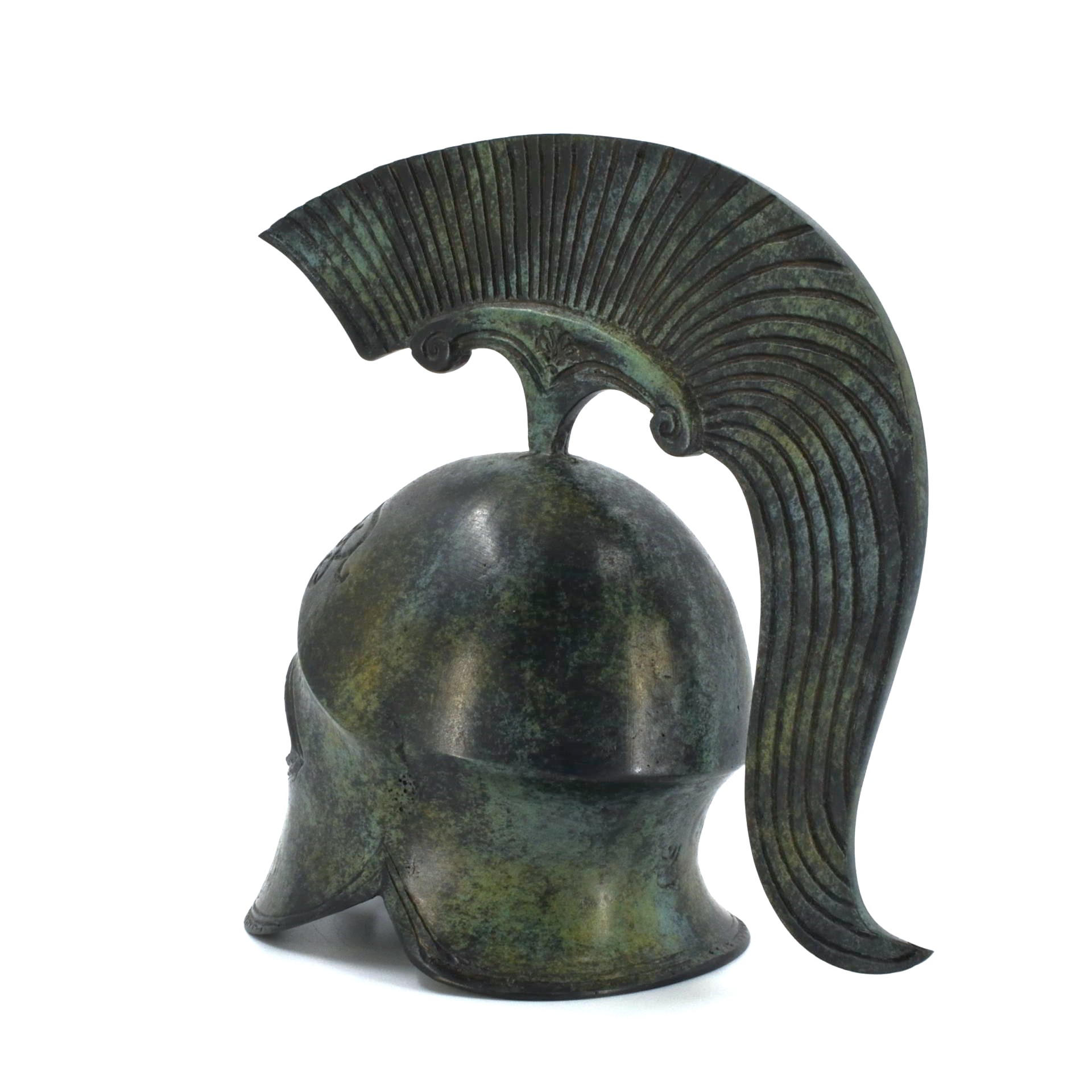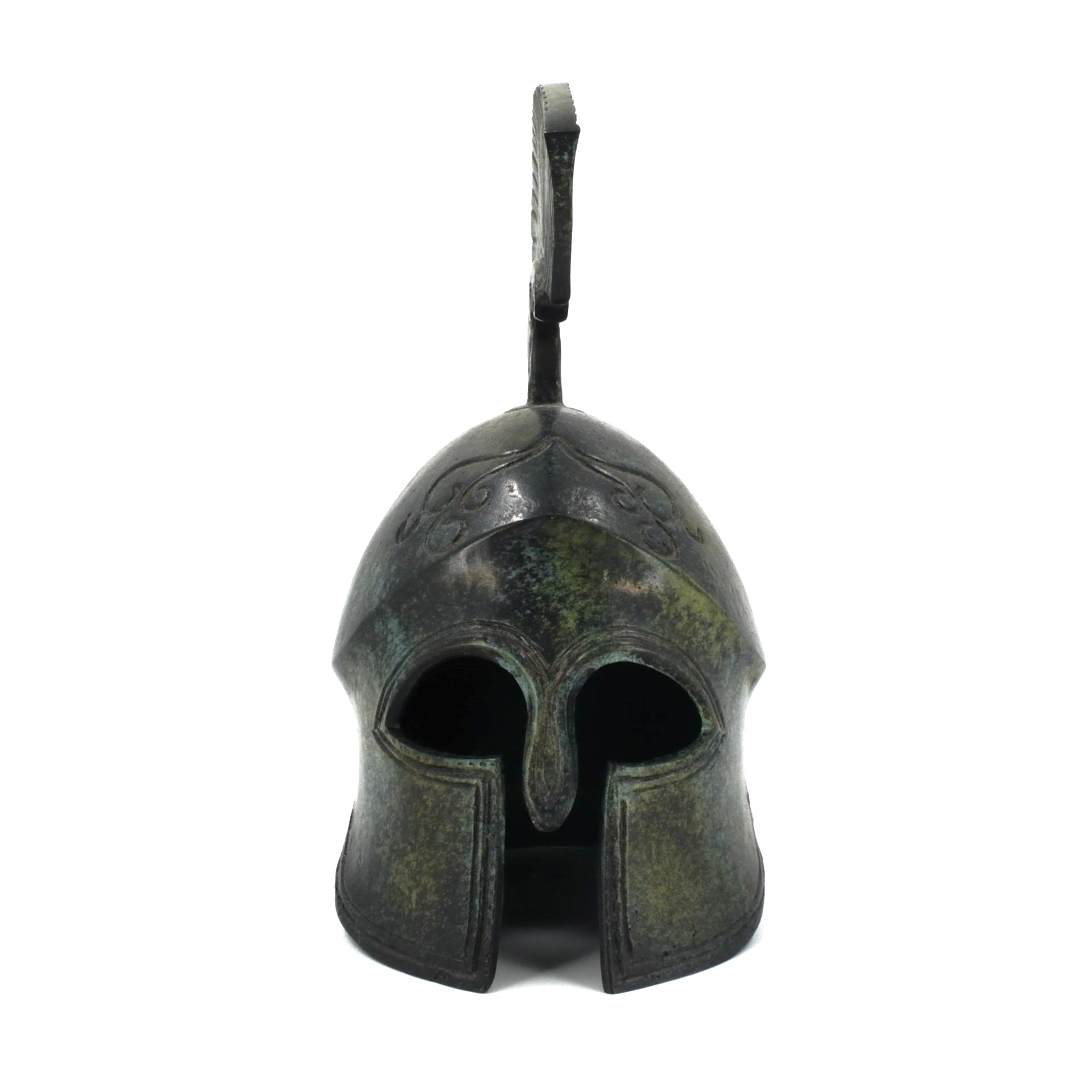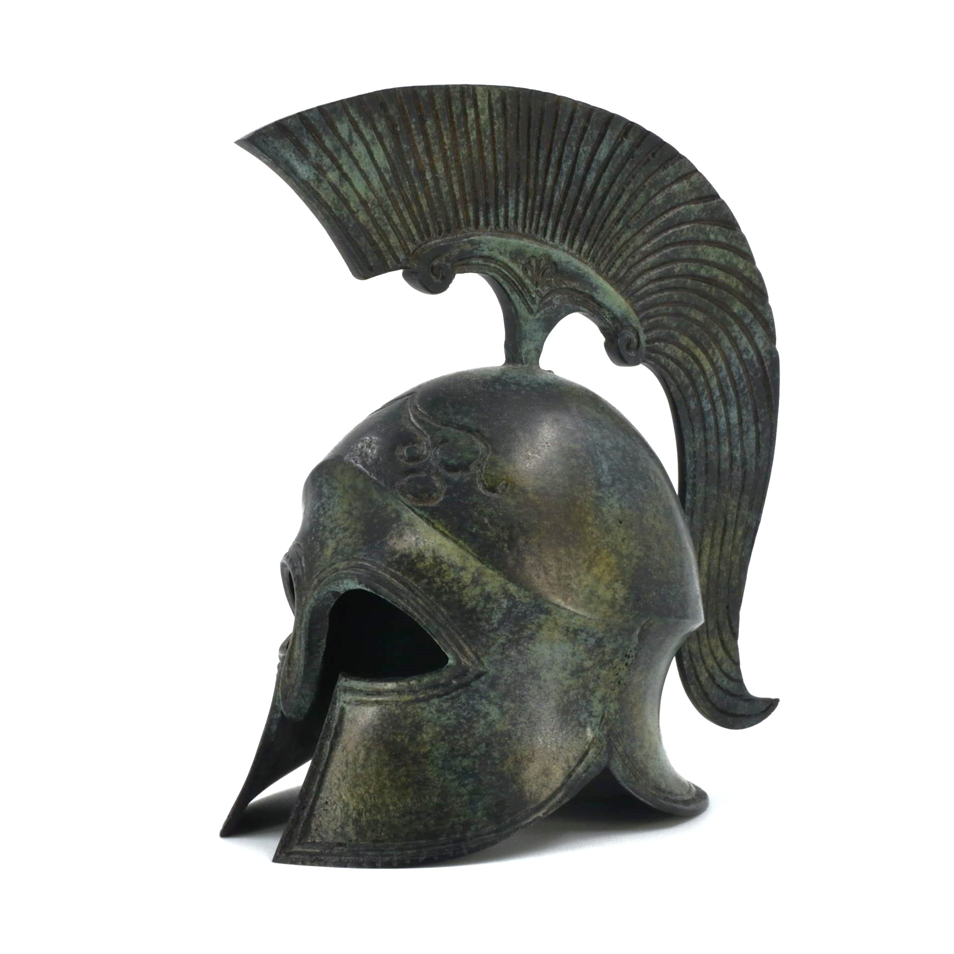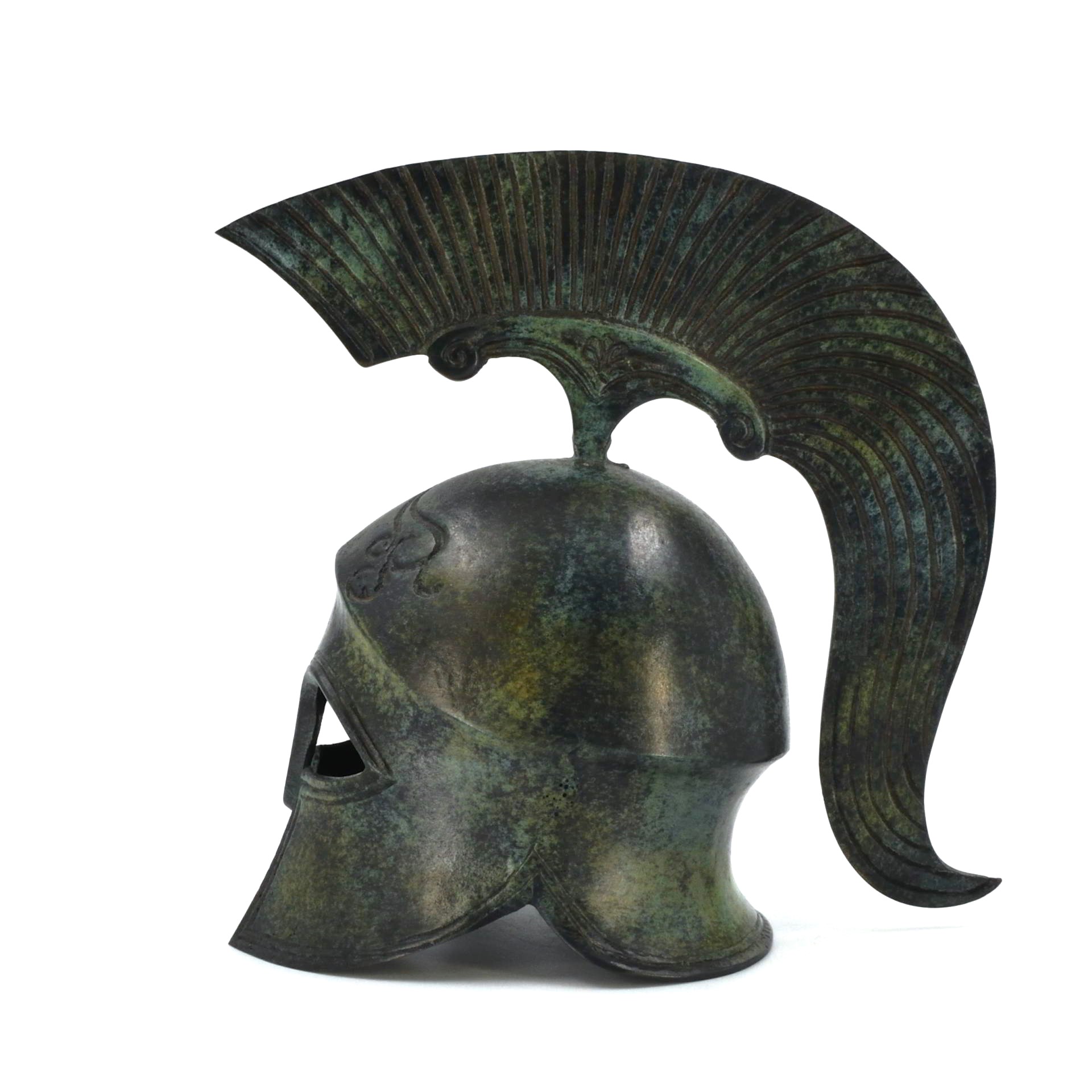 This helmet belongs to the Corinthian type, one of the most recognizable forms of protective headgear used by Greek hoplites. Its fully enclosing design, with narrow eye openings and an extended nose guard, reflects an emphasis on frontal protection during close-order combat. Rising from the crown is a high crest support, originally intended to carry a plume that increased the wearer’s height and visibility on the battlefield.