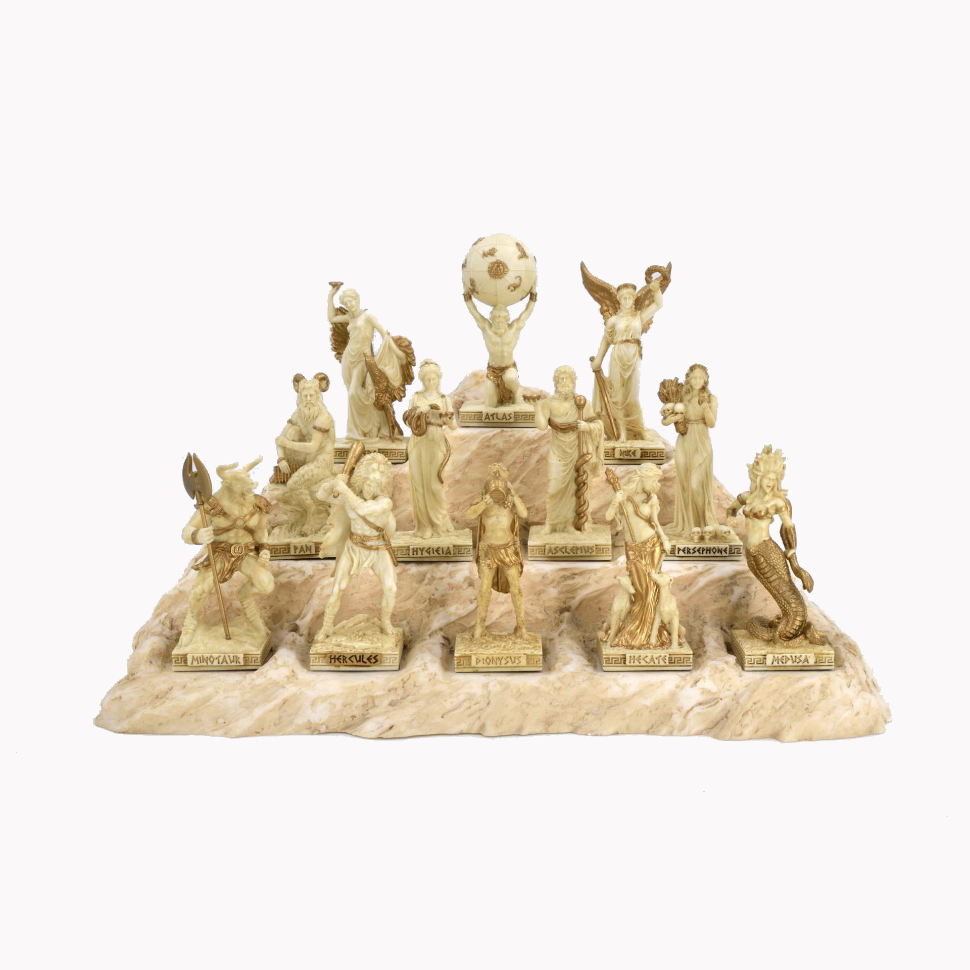 This exquisite collection of Greek mythology figures is displayed on a boulder-style base, representing the Olympian gods who ruled over ancient Greece. Each deity played a crucial role in mythology and was worshiped in different regions throughout history.