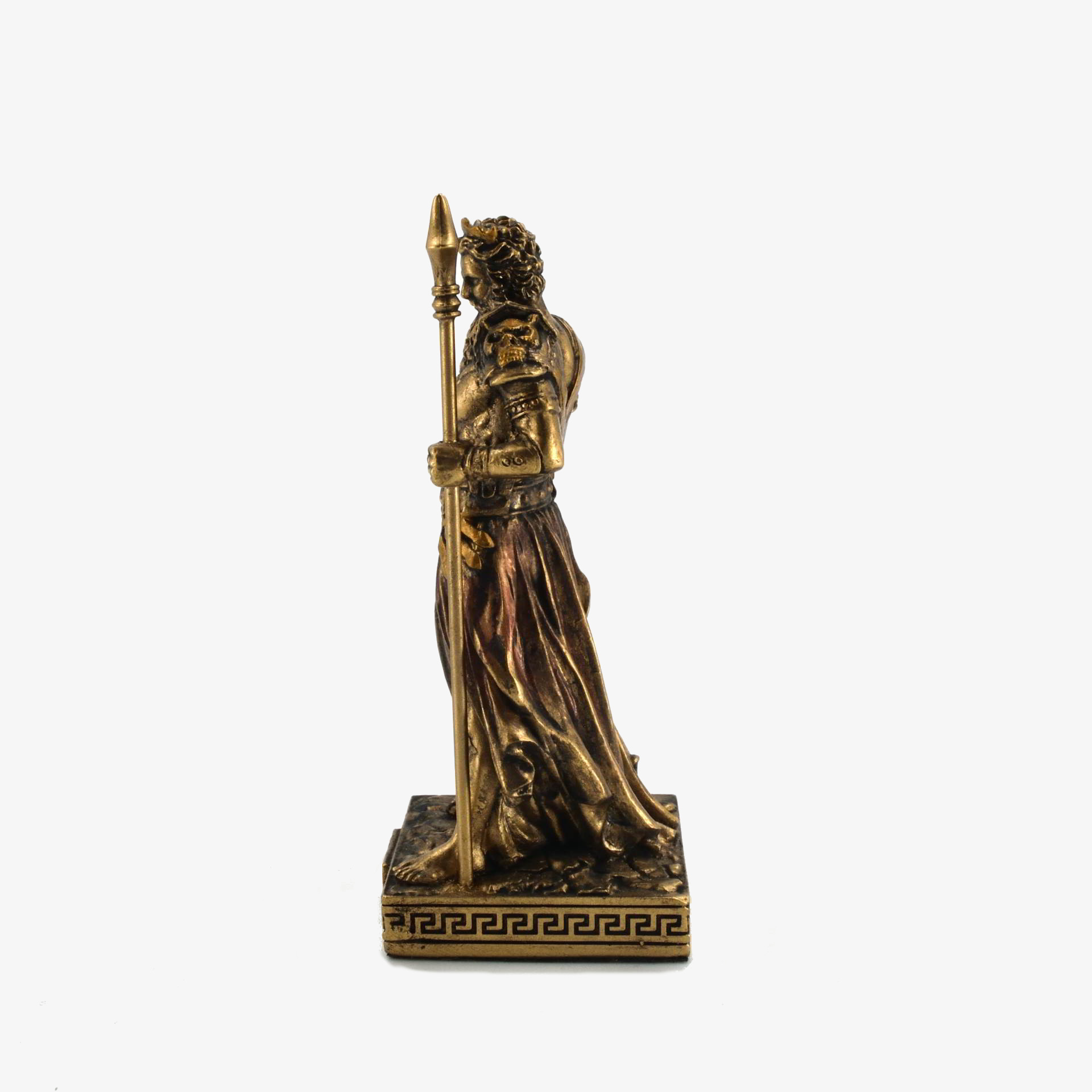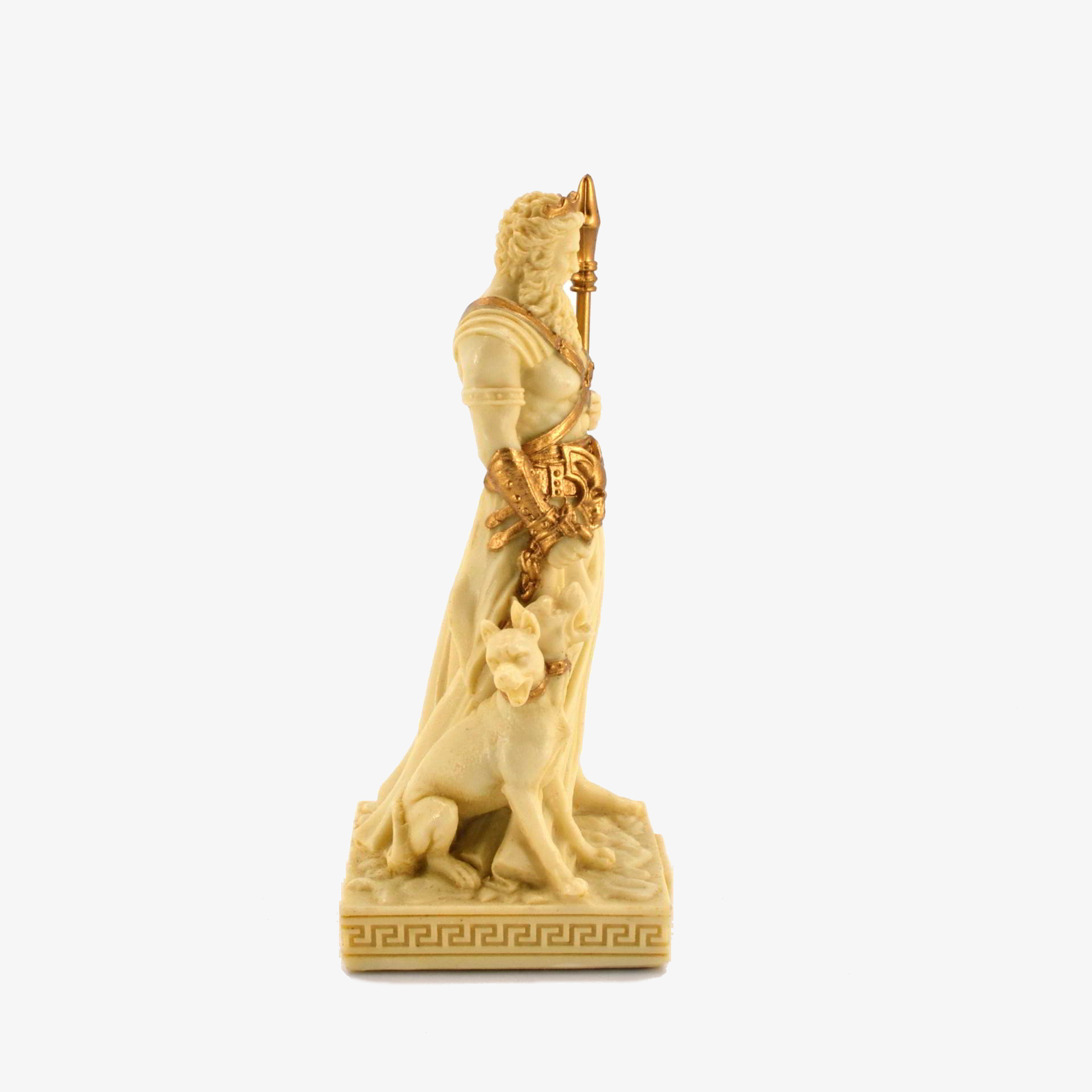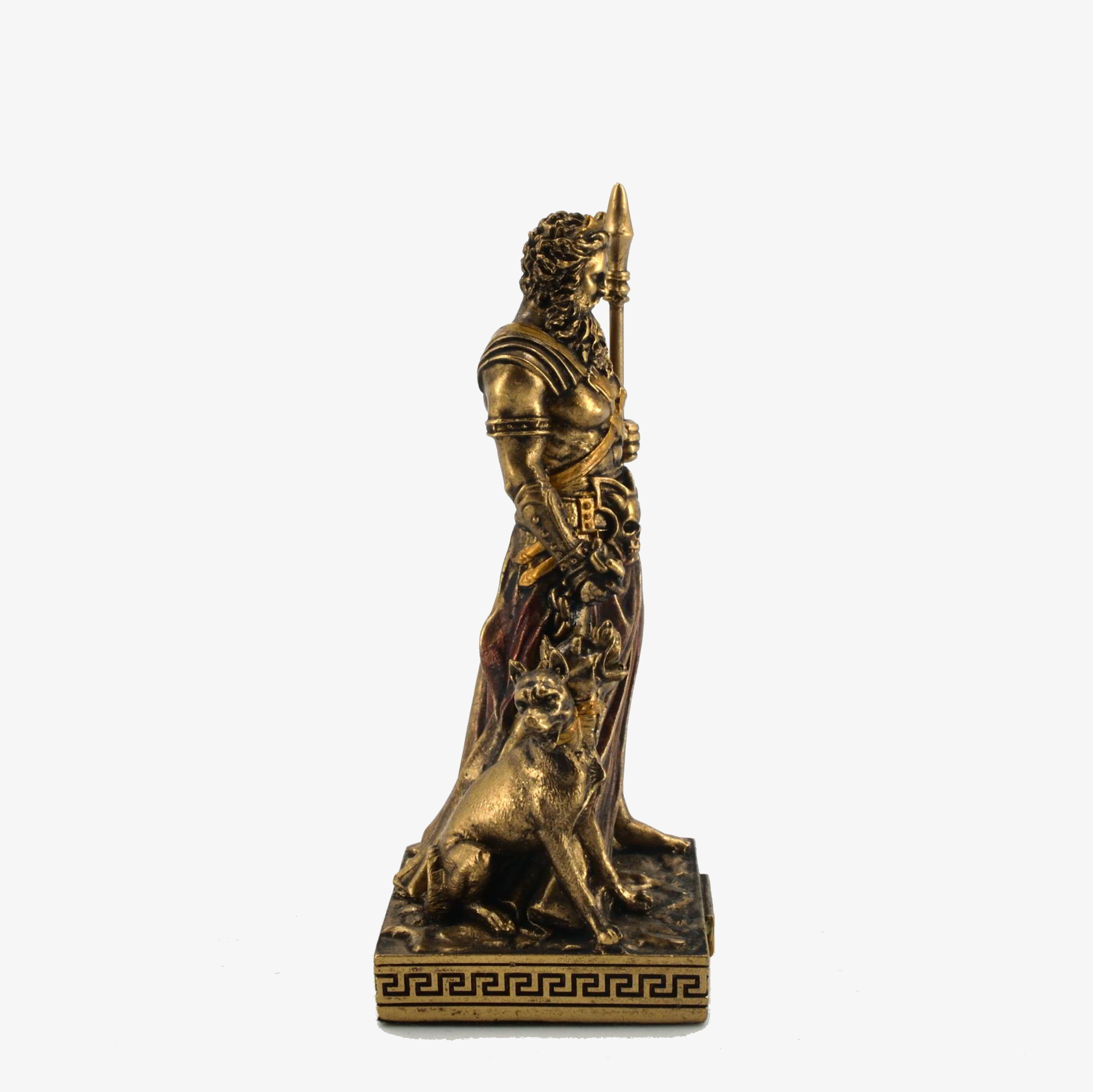 This bonded bronze statue depicts Hades, the Greek god of the underworld, standing powerfully with his three-headed guard dog, Cerberus. With a muscular form, flowing beard, and a golden crown, Hades holds a tall bident, symbolizing his dominion. His attire, adorned with skulls and chains, reinforces his connection to death and the afterlife. In mythology, Hades ruled the underworld, overseeing the souls of the dead and maintaining balance between life and death. Despite his dark domain, he was not considered evil but rather a just ruler. His most famous myth involves Persephone, whom he took as his queen.