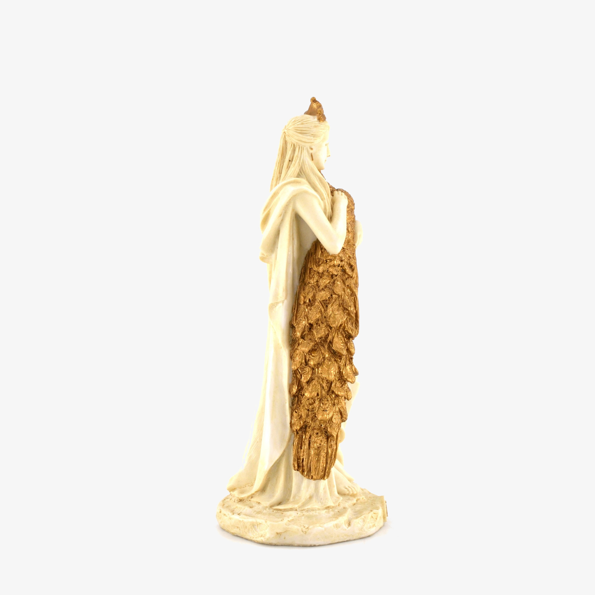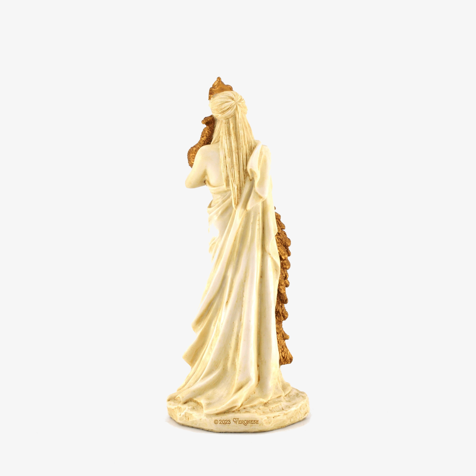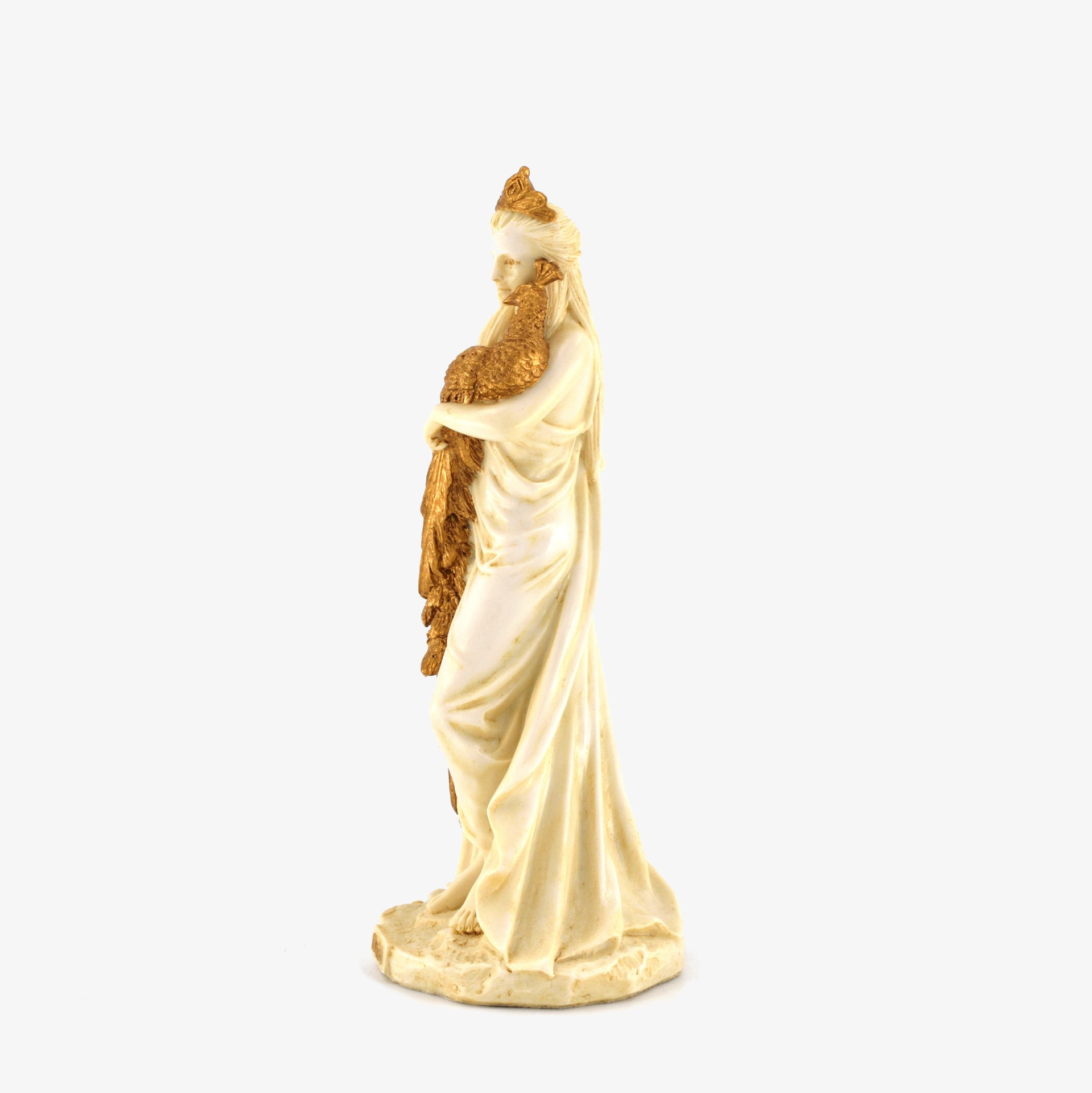 This bonded bronze figure depicts Hera, the Greek goddess of marriage, family, and queenship. She is elegantly draped in a flowing gown, wearing a crown, and holding a majestic peacock—her sacred symbol. As Zeus' wife and queen of Olympus, Hera was both revered and feared. She was known for her jealousy, particularly toward Zeus’ many lovers and illegitimate children. She tormented Heracles throughout his life and played a role in the Trojan War by favoring the Greeks. Despite her vengeful nature, she was also a protector of marriage and women. Her myths embody both divine authority and passionate rivalry.