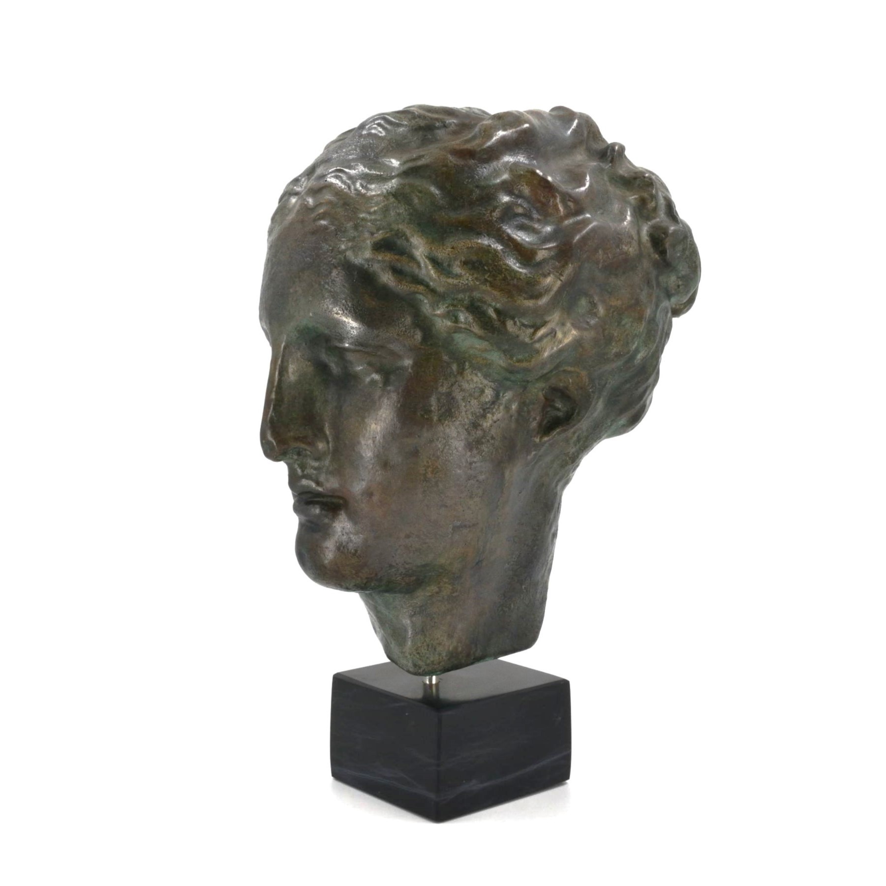 This sculpture reproduces the head of Hygieia, the ancient Greek goddess of health, cleanliness, and preventative medicine. The original statue was discovered at Tegea in Arcadia, an important religious center in the Peloponnese, and is now preserved in the National Archaeological Museum of Athens. Hygieia was the daughter and companion of Asclepius, the Greek god of healing, and was widely venerated in sanctuaries dedicated to health and medicine throughout the ancient Greek world.