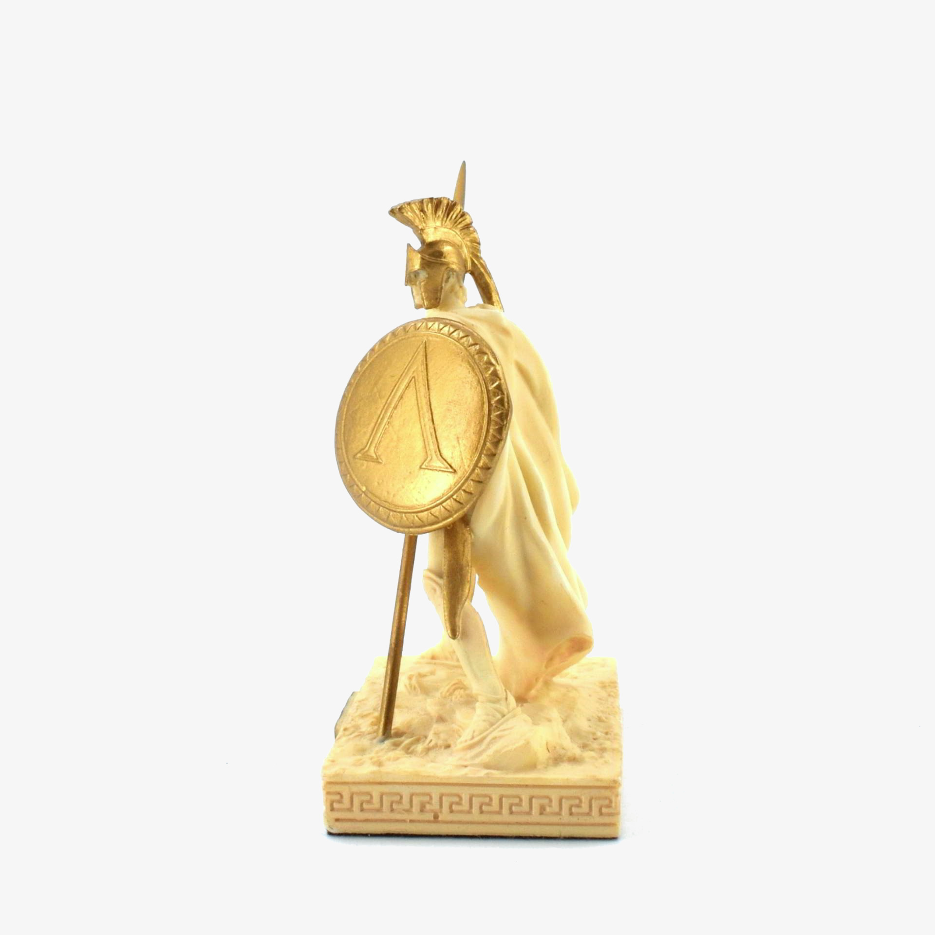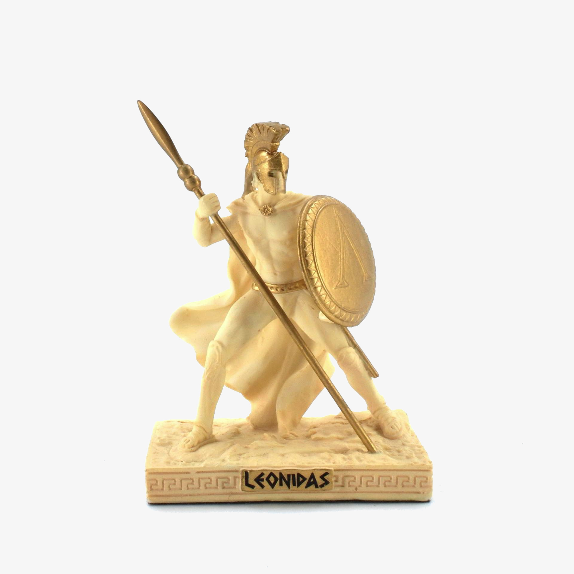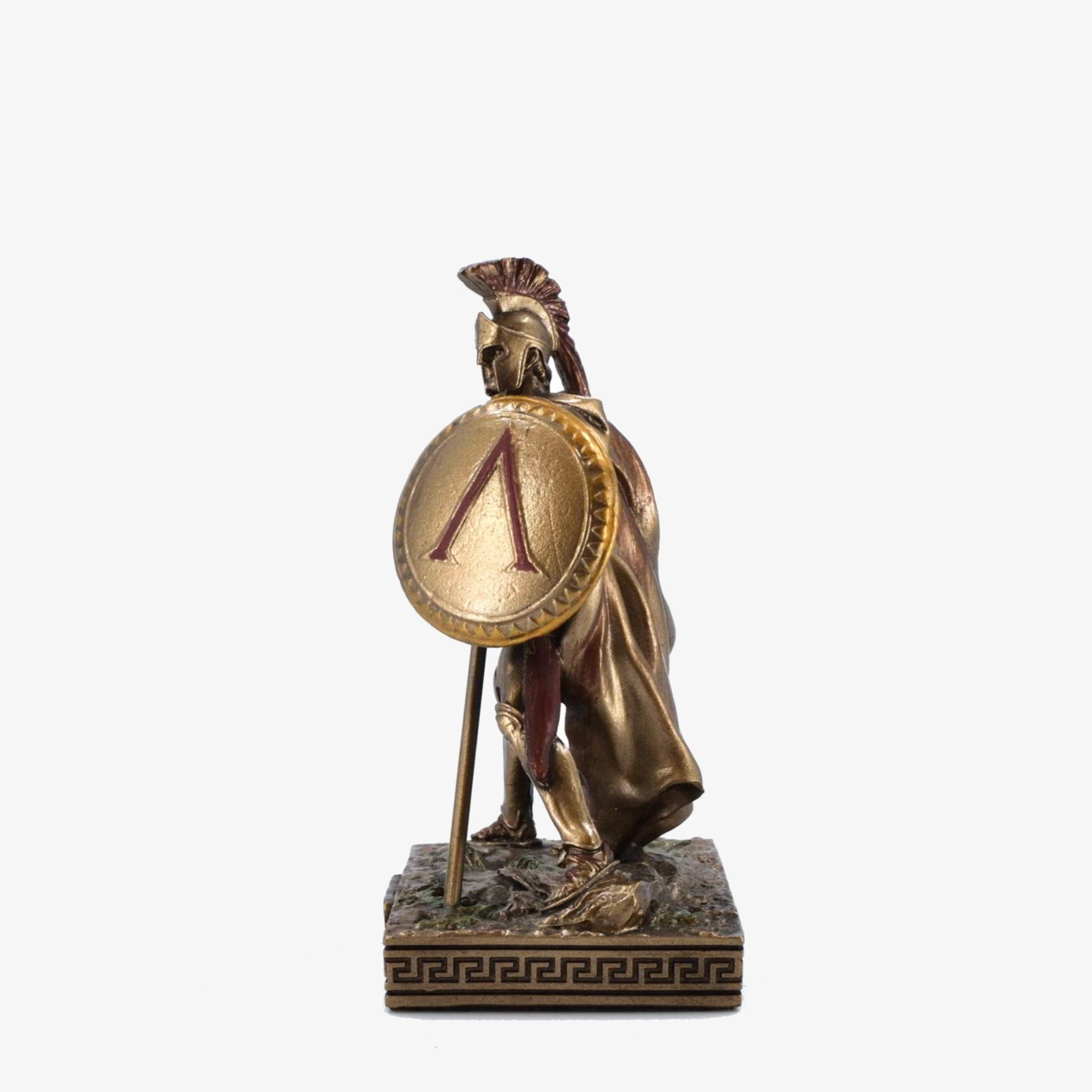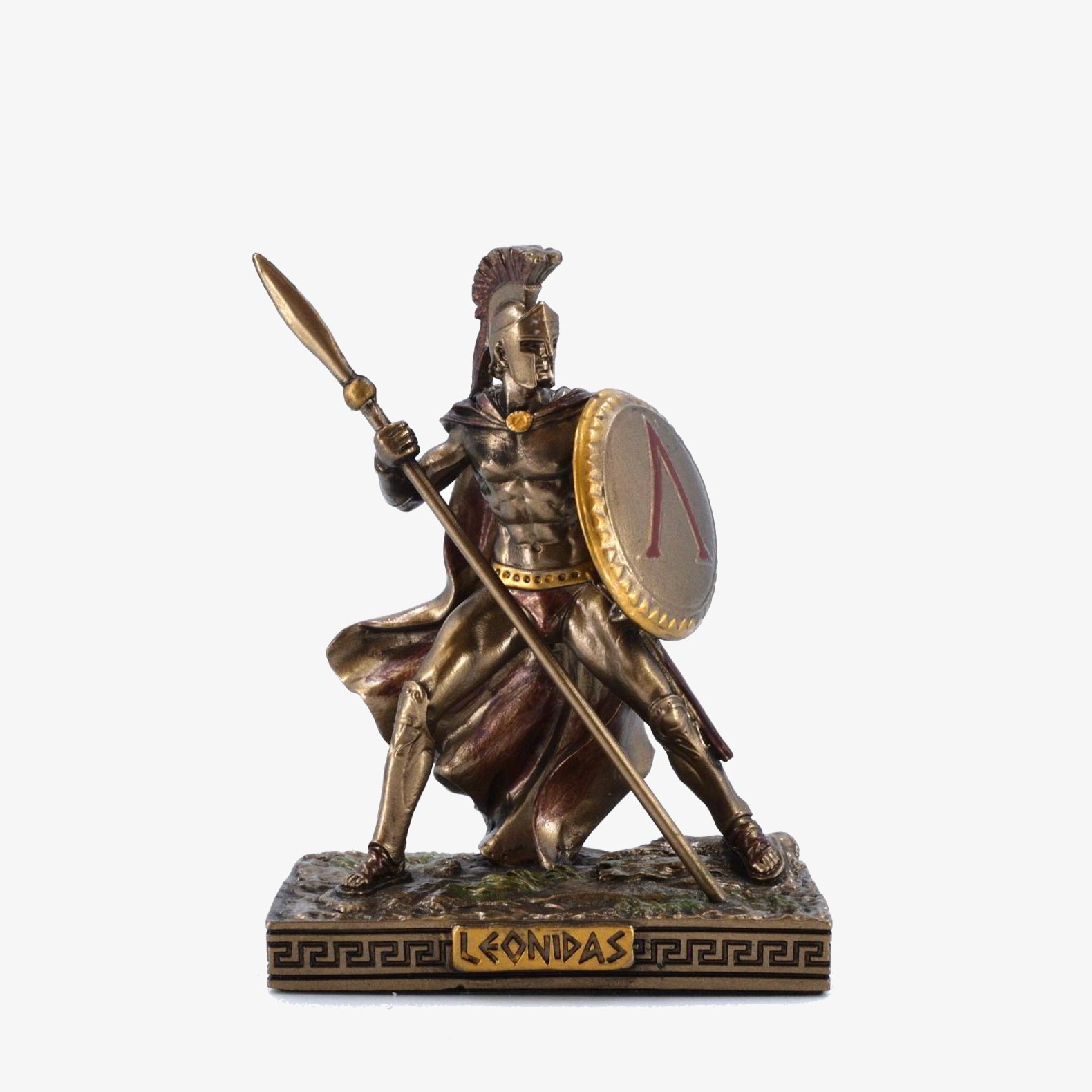 This imposing bonded bronze statue of Leonidas of Sparta stands as a testament to the indomitable spirit and martial prowess of one of ancient Greece's most revered leaders. Crafted with meticulous attention to detail, the sculpturer captures the essence of Leonidas in a moment of resolute determination. The statue portrays Leonidas during the Battle of Thermopylae. His finely chiseled features convey a stern and focused gaze, reflecting the stoic resolve for which Spartans were renowned. His helmet, adorned with a horsehair crest, adds an authentic touch, symbolizing both protection and intimidation. In one hand, Leonidas firmly grasps the hilt of a spear, while the other holds a shield bearing the distinctive lambda insignia. The dynamic pose captures the essence of his leadership on the battlefield, exuding an aura of unwavering courage and commitment to duty. The flowing lines of his cloak, billowing in the imagined wind of conflict, lend a sense of movement and urgency to the composition.