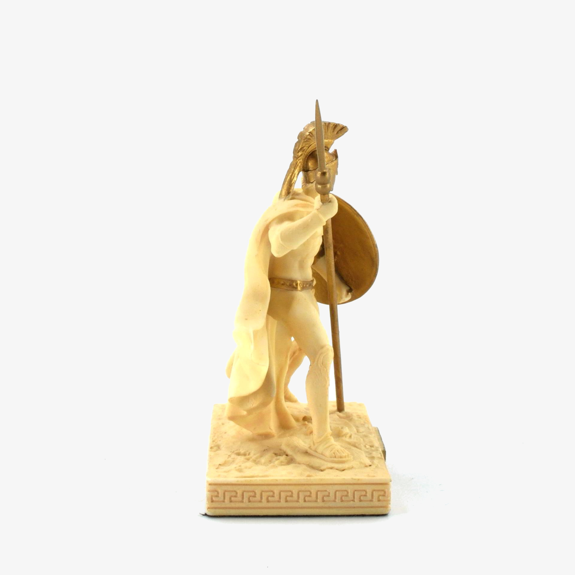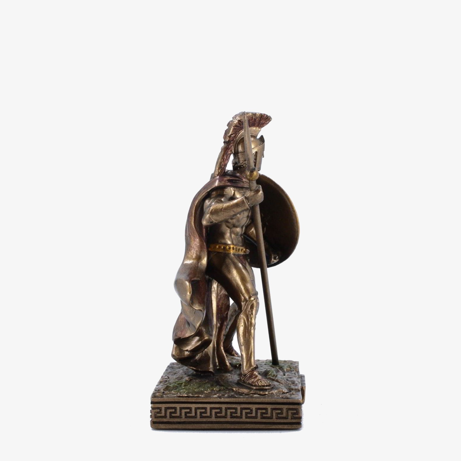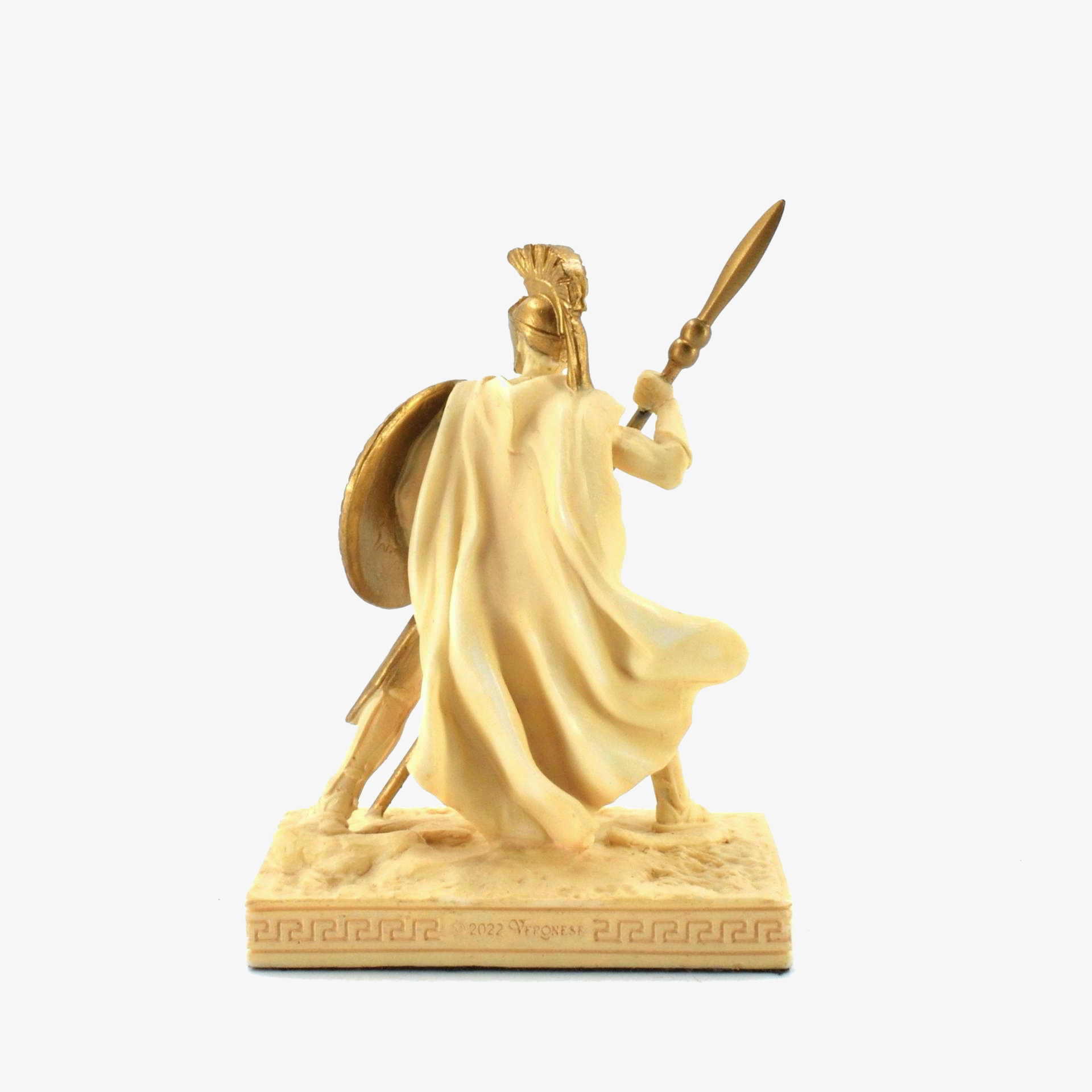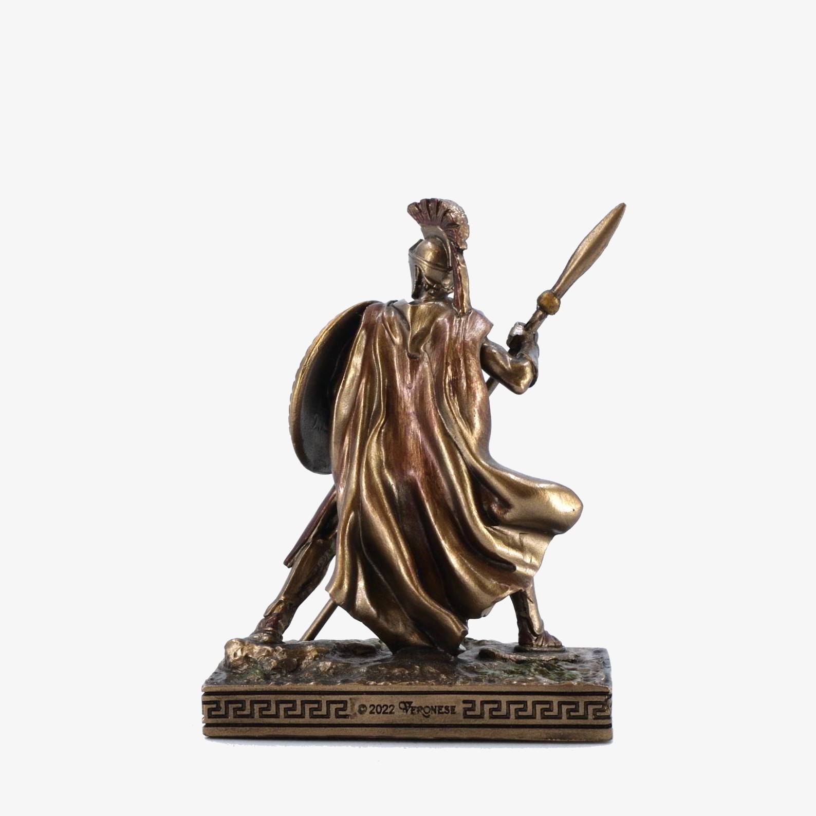 This imposing bonded bronze statue of Leonidas of Sparta stands as a testament to the indomitable spirit and martial prowess of one of ancient Greece's most revered leaders. Crafted with meticulous attention to detail, the sculpturer captures the essence of Leonidas in a moment of resolute determination. The statue portrays Leonidas during the Battle of Thermopylae. His finely chiseled features convey a stern and focused gaze, reflecting the stoic resolve for which Spartans were renowned. His helmet, adorned with a horsehair crest, adds an authentic touch, symbolizing both protection and intimidation. In one hand, Leonidas firmly grasps the hilt of a spear, while the other holds a shield bearing the distinctive lambda insignia. The dynamic pose captures the essence of his leadership on the battlefield, exuding an aura of unwavering courage and commitment to duty. The flowing lines of his cloak, billowing in the imagined wind of conflict, lend a sense of movement and urgency to the composition.