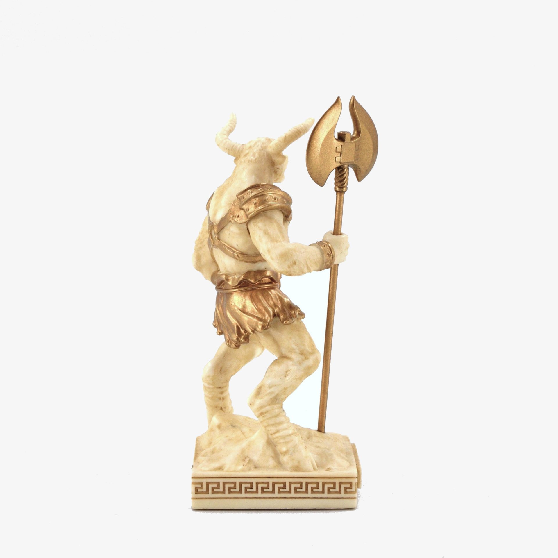 This bonded bronze figure depicts the Minotaur, a legendary creature from Greek mythology with the head of a bull and the body of a man. Born from the union of Queen Pasiphaë of Crete and a divine bull, the Minotaur was confined to the Labyrinth by King Minos. A fearsome guardian, he was ultimately slain by the Athenian hero Theseus, who used a thread from Ariadne to navigate the maze. This striking sculpture captures the Minotaur’s raw power, clad in battle armor and wielding a deadly weapon, symbolizing his legendary role in myth and his tragic fate within the Labyrinth.