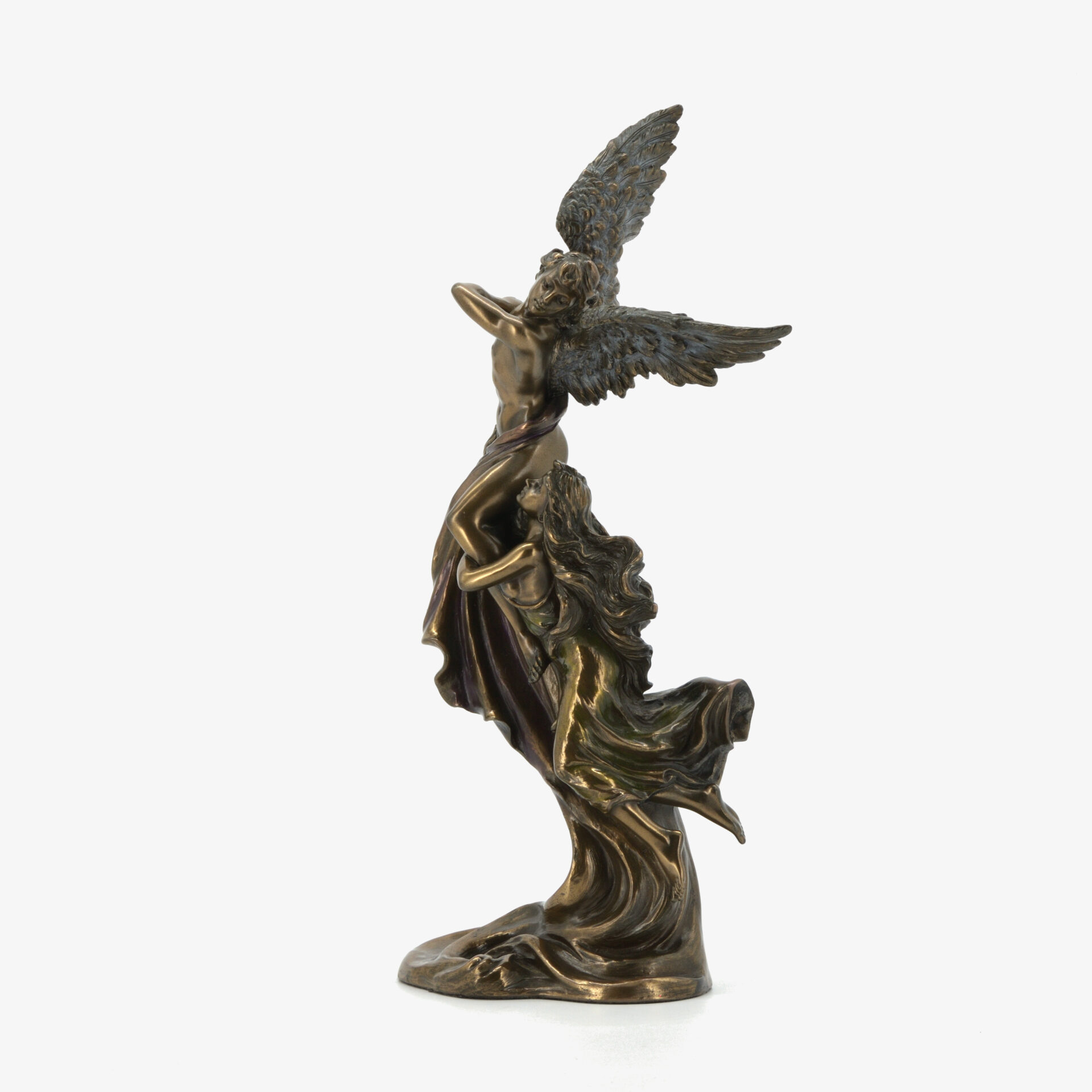 This bonded bronze sculpture captures the mythic moment when Eros lifts Psyche from the mortal world and carries her to his secret palace, suspended between earth and destiny. With wings fully unfurled and bow drawn close, Eros embodies divine strength tempered by devotion. Psyche rises in his grasp, her form turning upward in trust, wonder, and surrender to a love she has not yet been allowed to see.