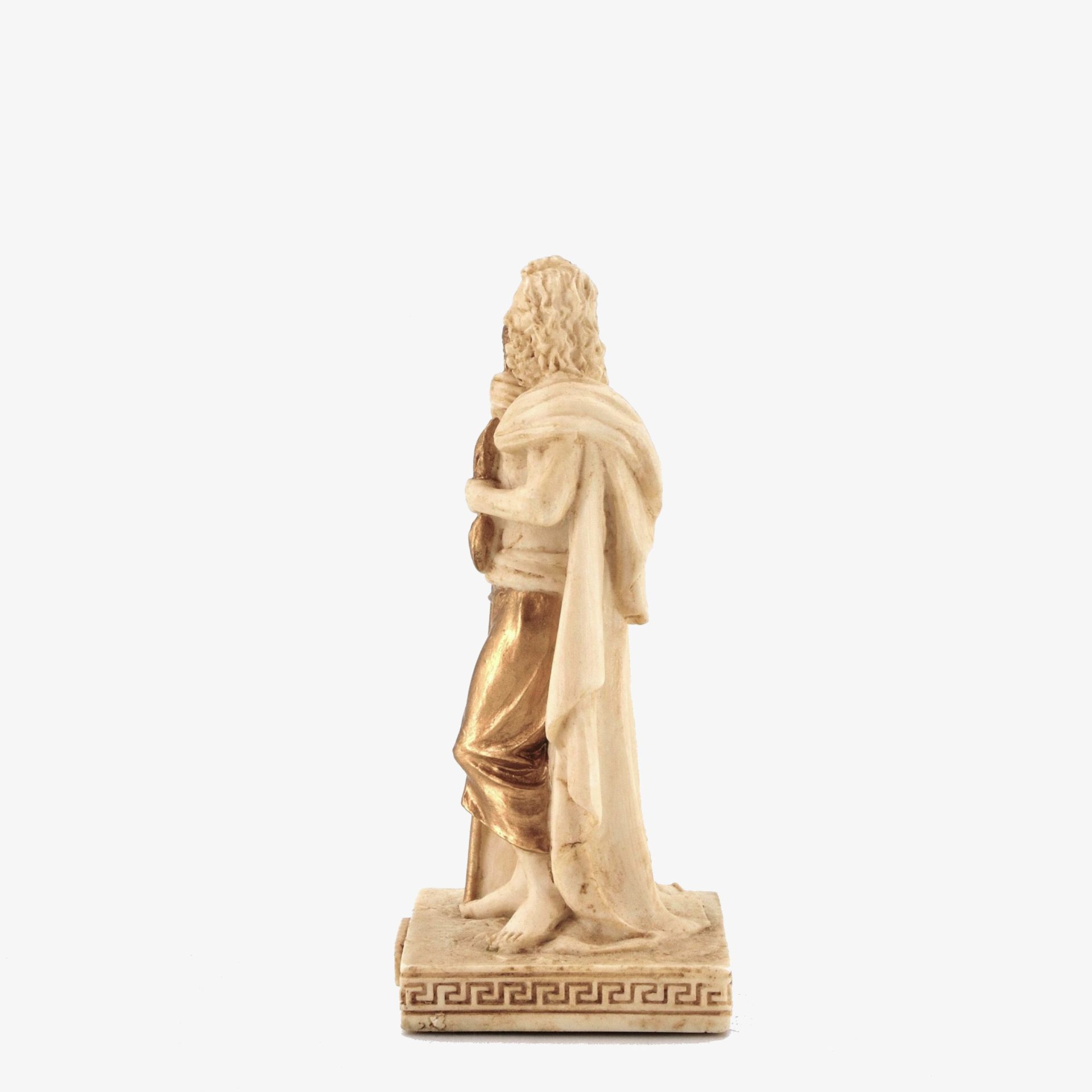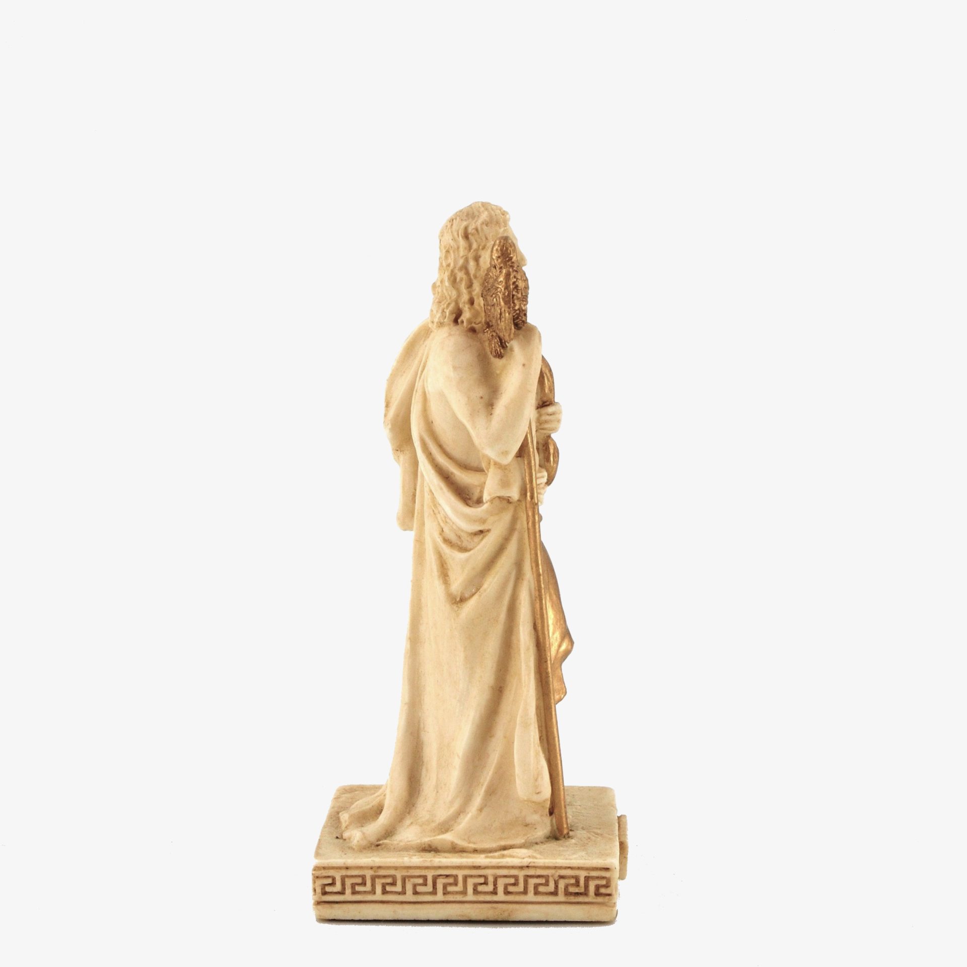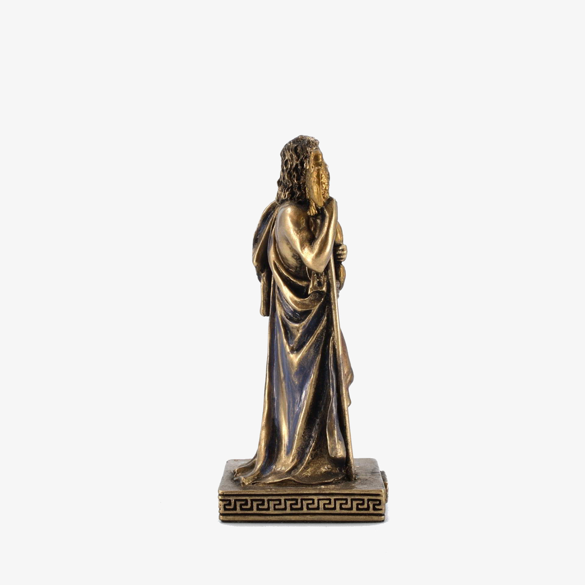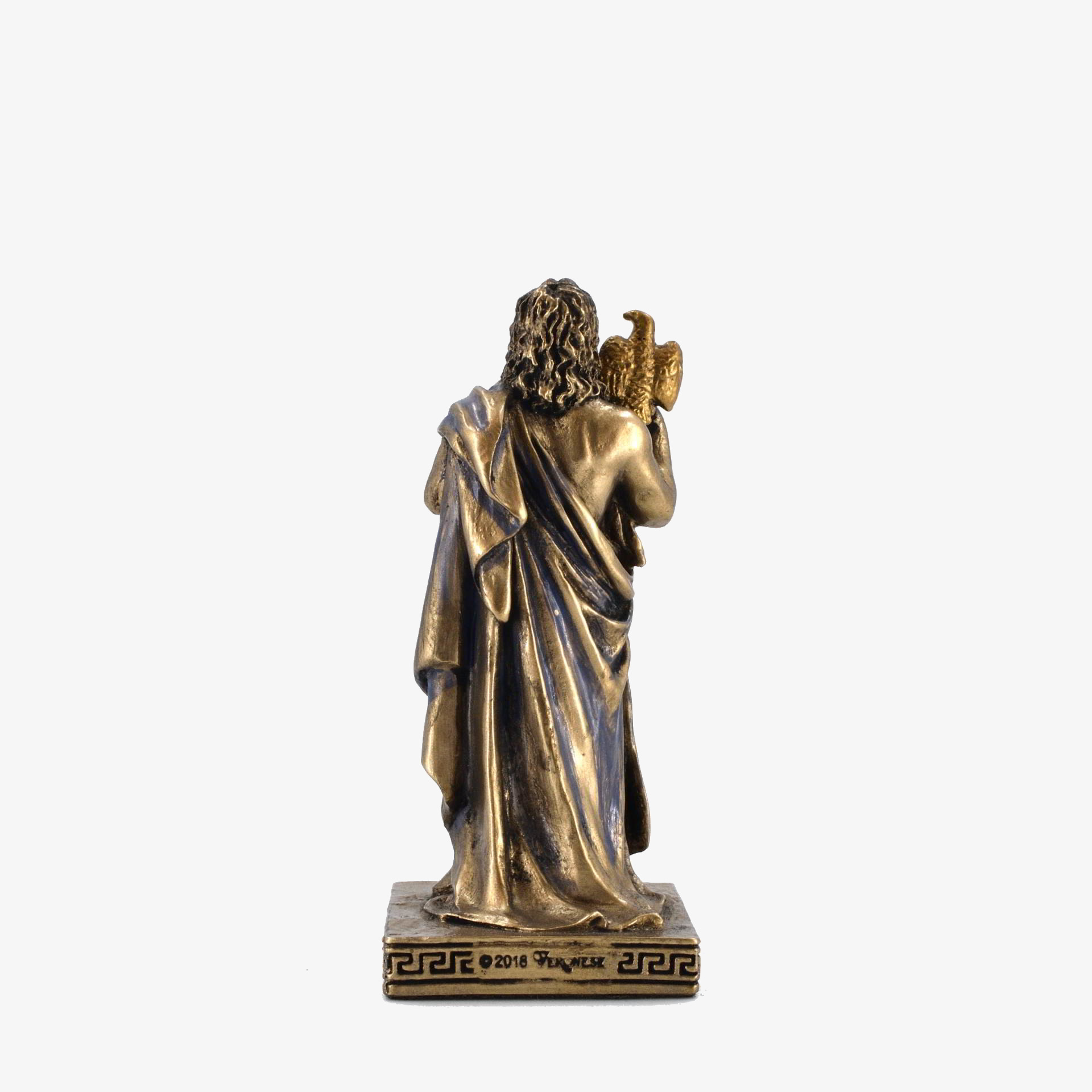 This bonded bronze figure represents Zeus, the supreme god of Greek mythology, standing with a scepter and an eagle, his sacred symbol. Zeus, ruler of Mount Olympus, controlled the sky and thunder, enforcing order among gods and mortals. Worship of Zeus spanned from the Mycenaean period (c. 1600 BCE) to the rise of Christianity (4th century CE), with major cult centers in Olympia, Dodona, and Athens. His grandest festival, the Olympic Games, was held in his honor. Temples like the massive Zeus temple in Olympia showcased his importance in ancient Greek religion and society.