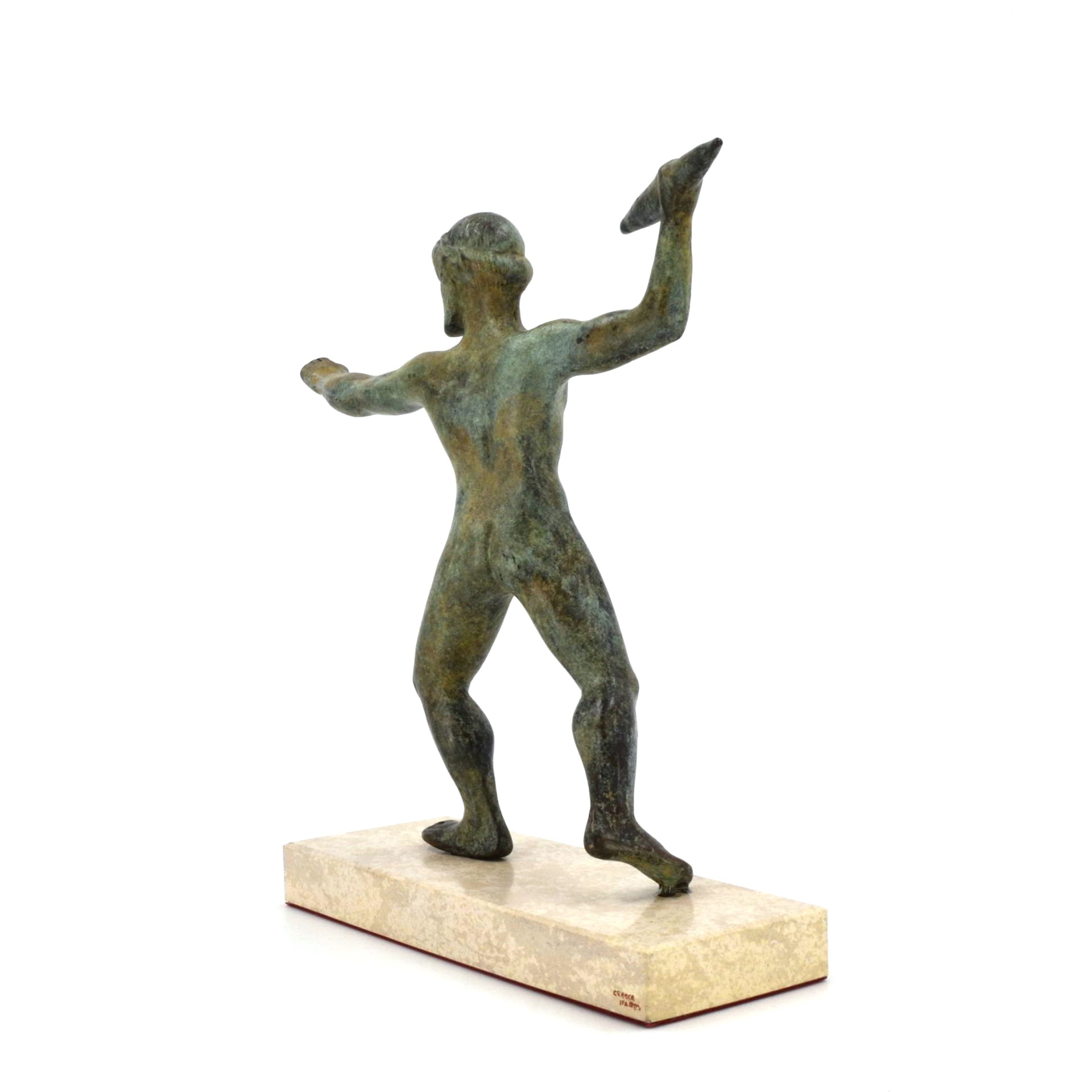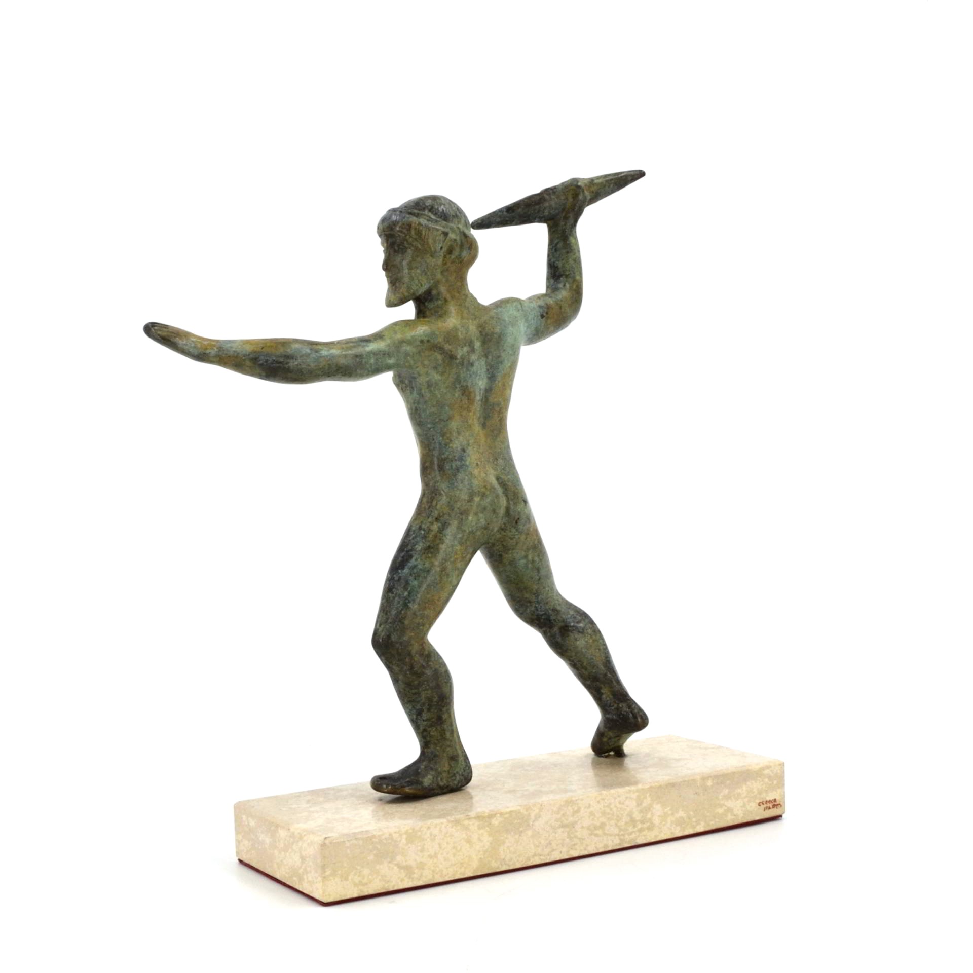 In this dynamic pose, Zeus strides forward, arm extended to hurl his thunderbolt while the other arm once held the aegis, symbol of divine authority and storm power. Such figures were created as votive offerings, dedicated by worshippers seeking protection, guidance, or favor from the king of the gods. This sculptural type reflects the transition from Archaic rigidity to the emerging naturalism of the Early Classical era, capturing strength, balance, and divine motion. It embodies both religious devotion and the artistic refinement of 5th-century BC Greece.