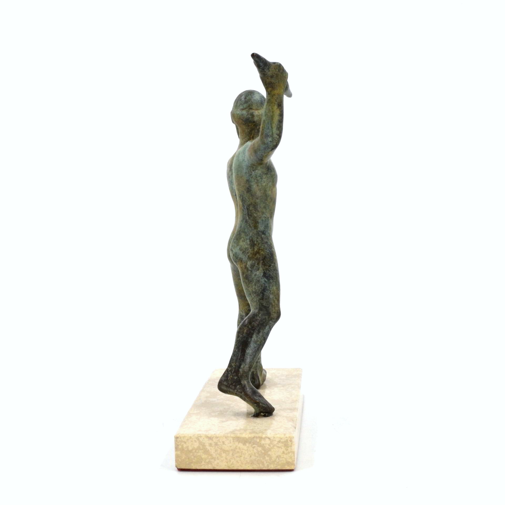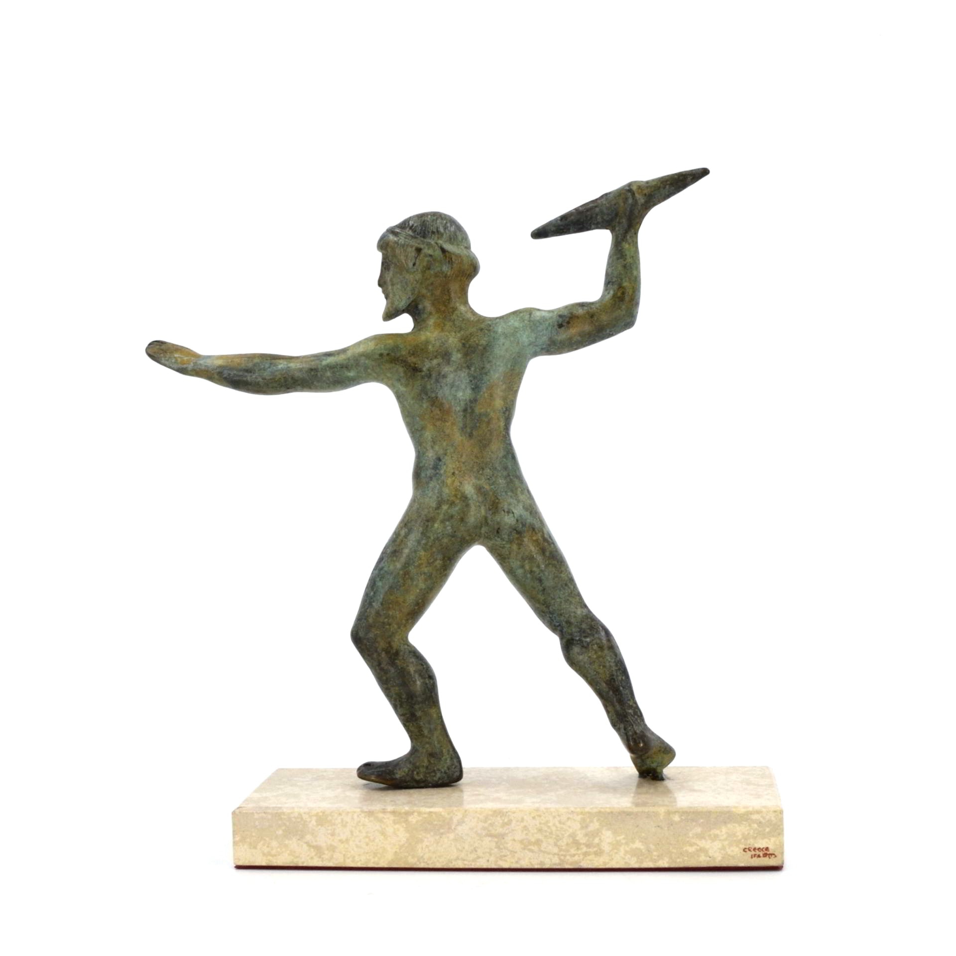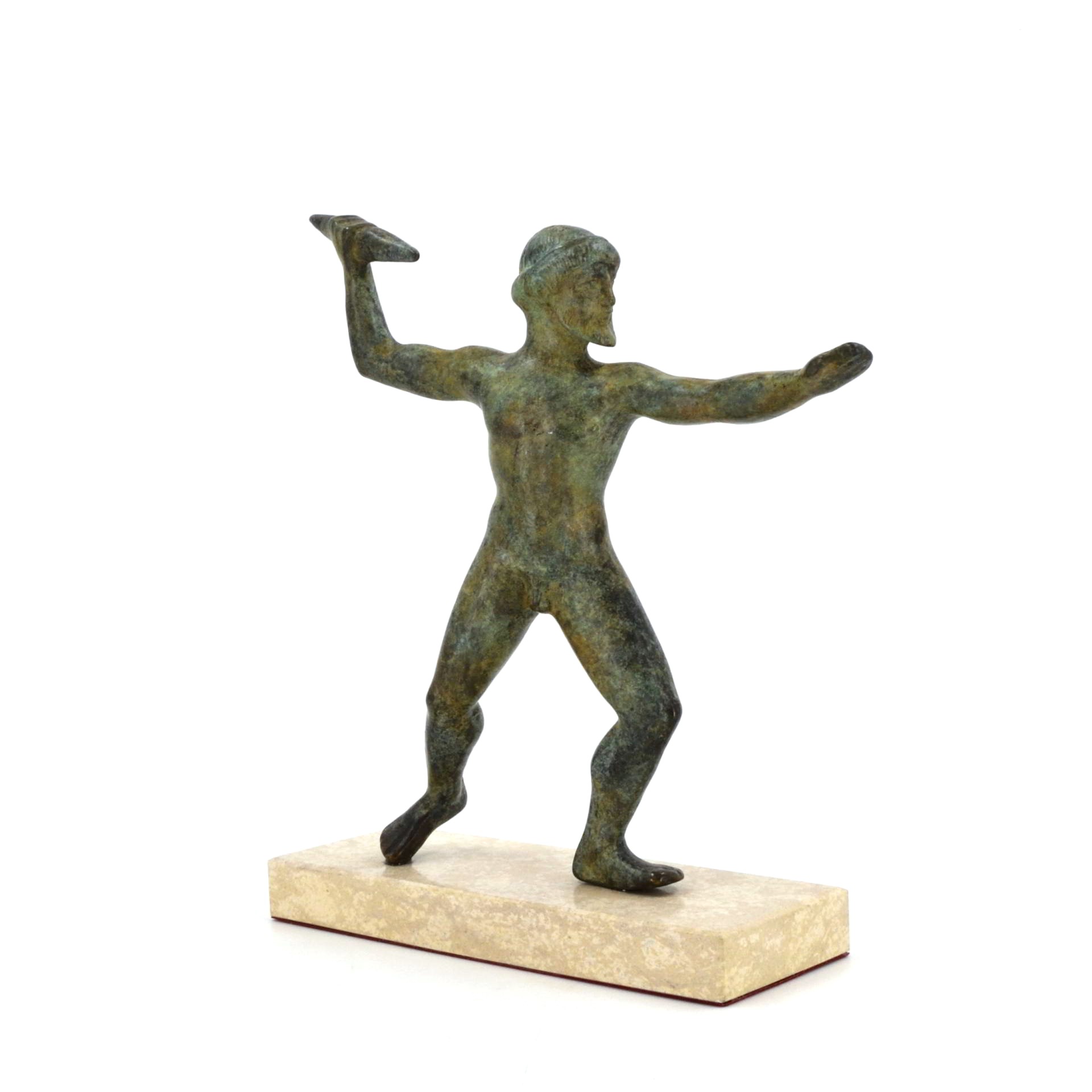 Replica of the Early Classical Zeus Aigiochos from Dodona (c. 480 BC), depicting the thunderbolt-bearing king of the Greek gods in dynamic stride.